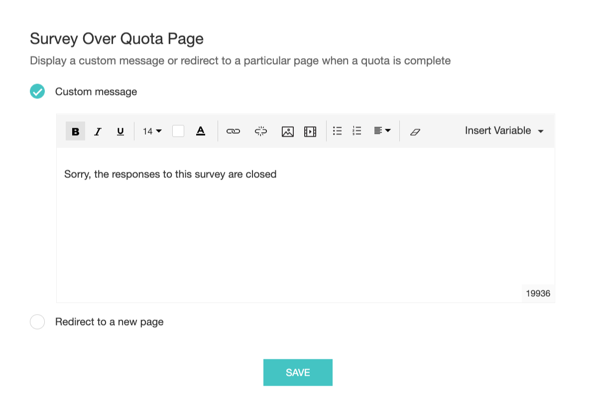 Custom message - Add a custom message to display to your respondents. You can apply styles and formatting by using the rich text editor.