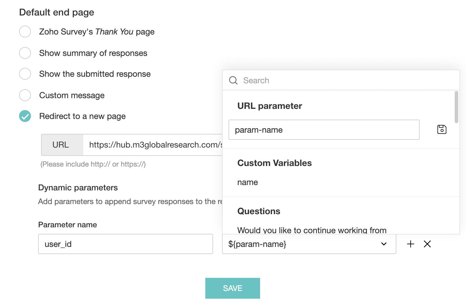 - Enter the parameter name. For example, you can pass a URL parameter in the survey URL shared with your respondent. If you want the data passed on to the survey URL to be shown under the redirect URL, you can add it directly as a parameter name here.