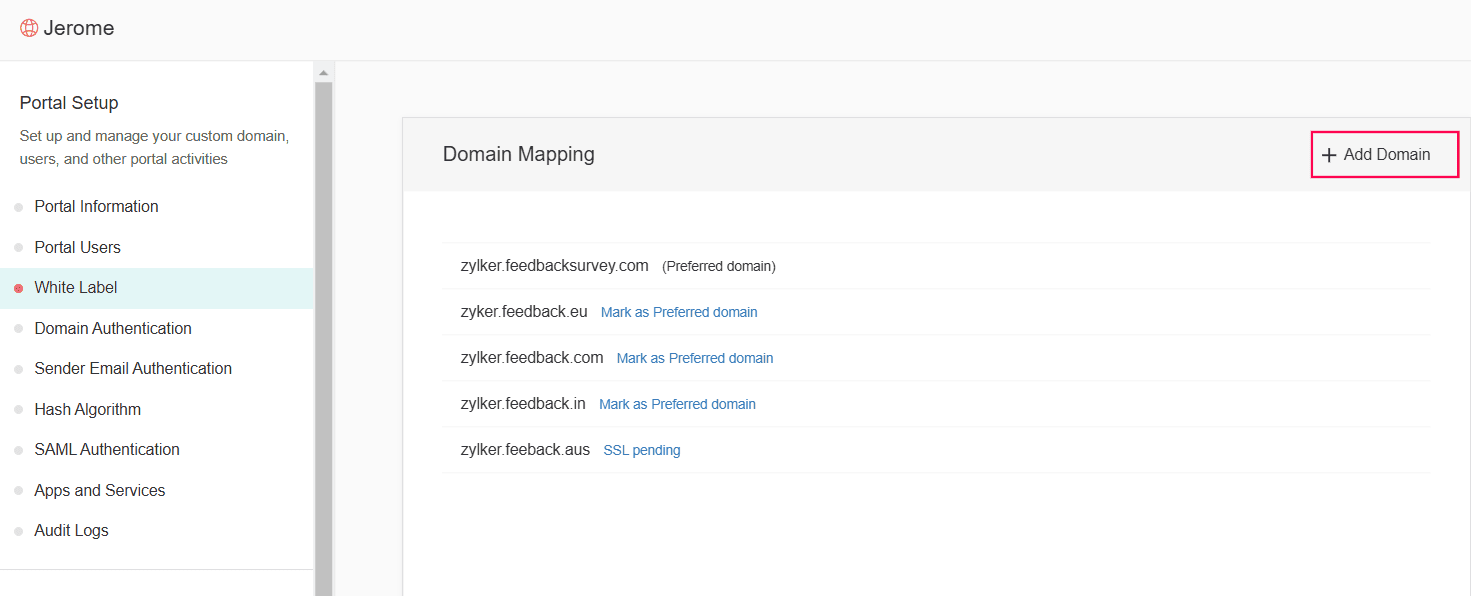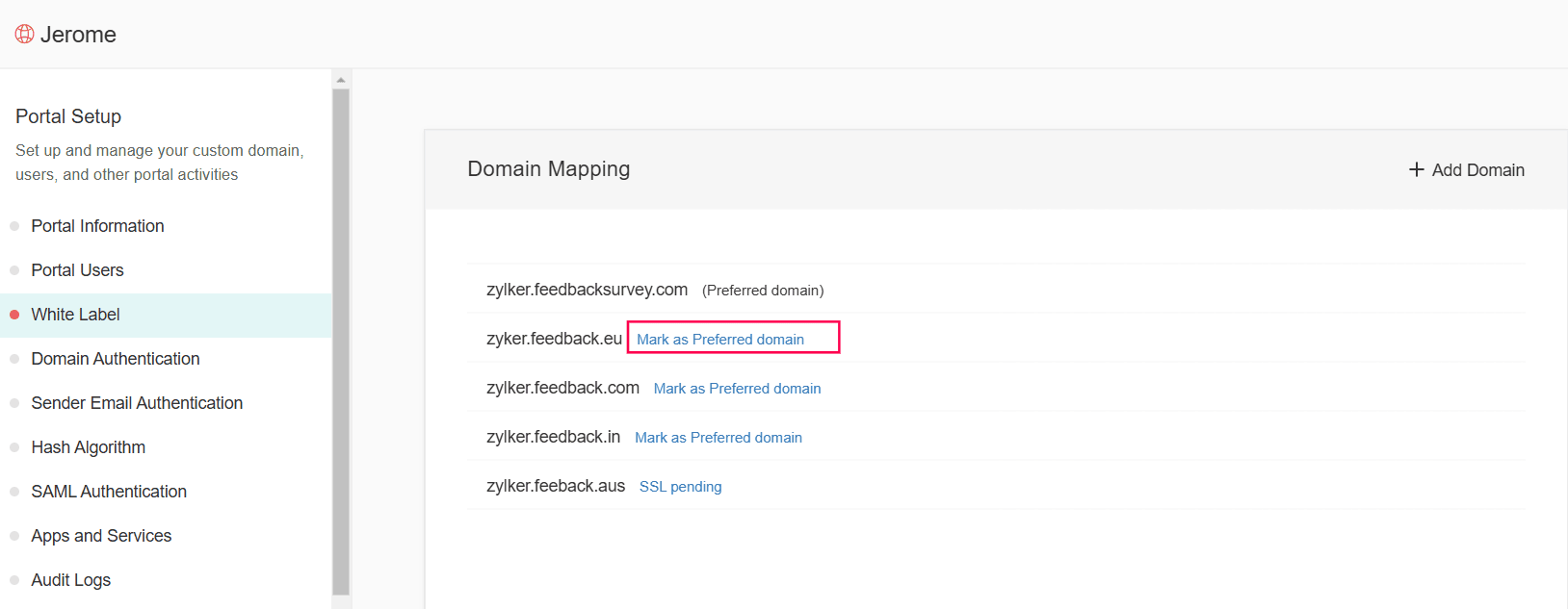 The preferred domain provides you with the option to set the custom domain among the custom domain you've added according to your functionality.For example, if your admin has set a preferred domain at the portal level for enhancing the user experience of respondents, but you wish to change it to a local domain for your department/business unit level convenience or use cases, it can be done.