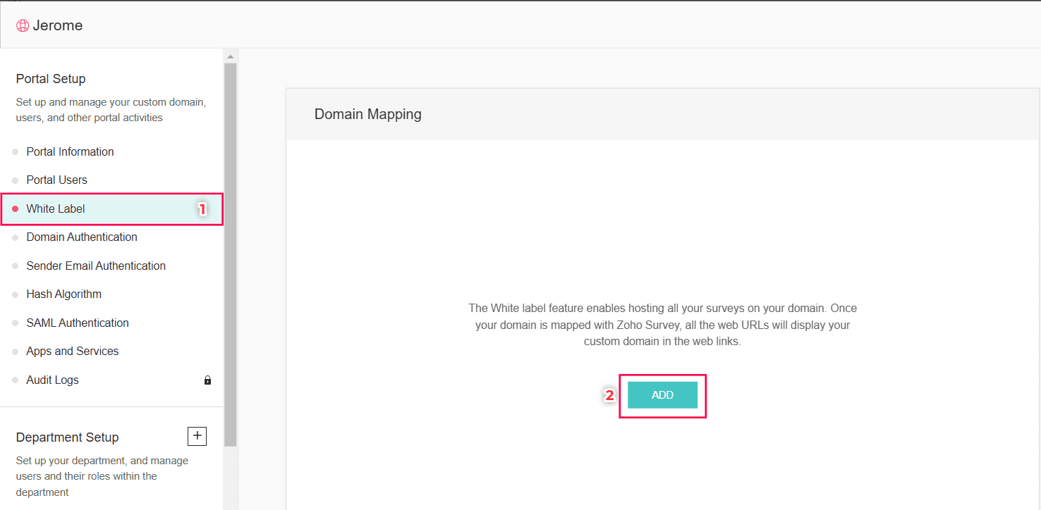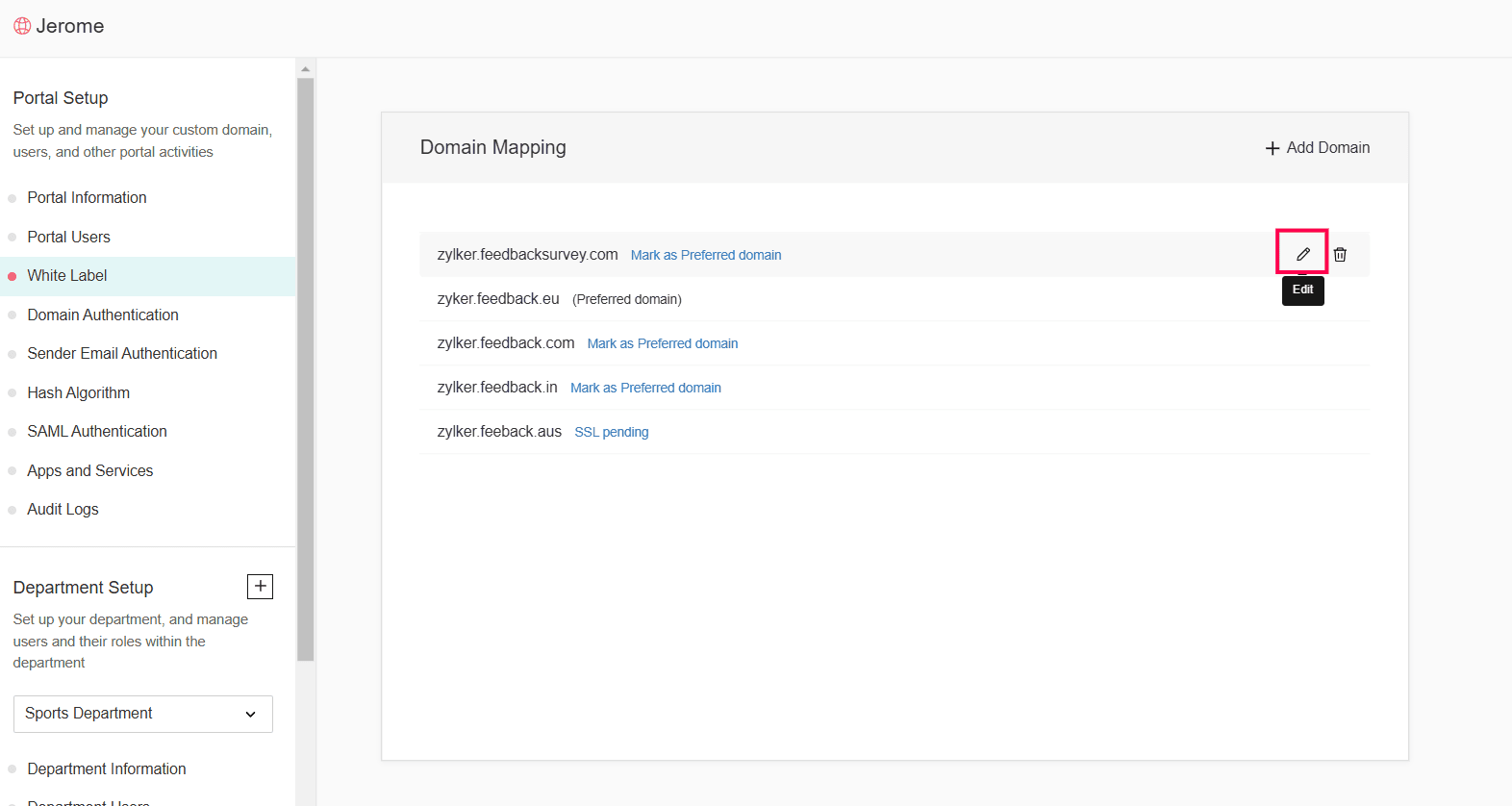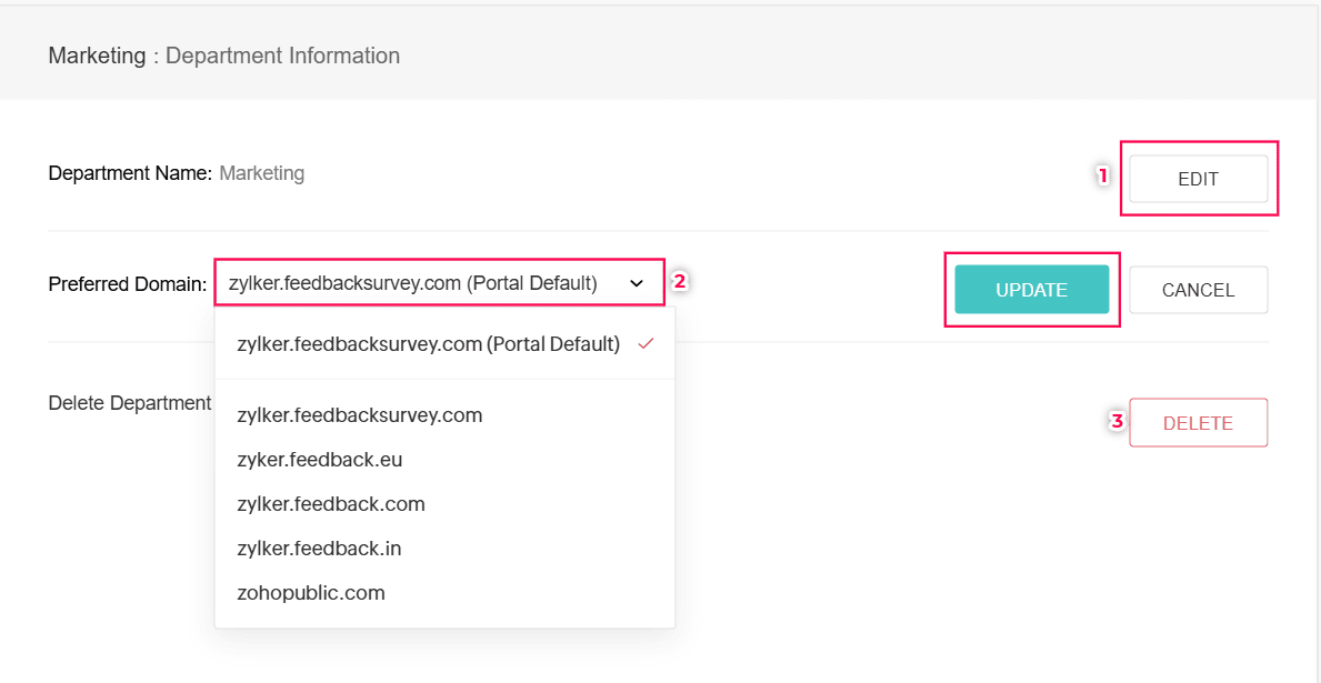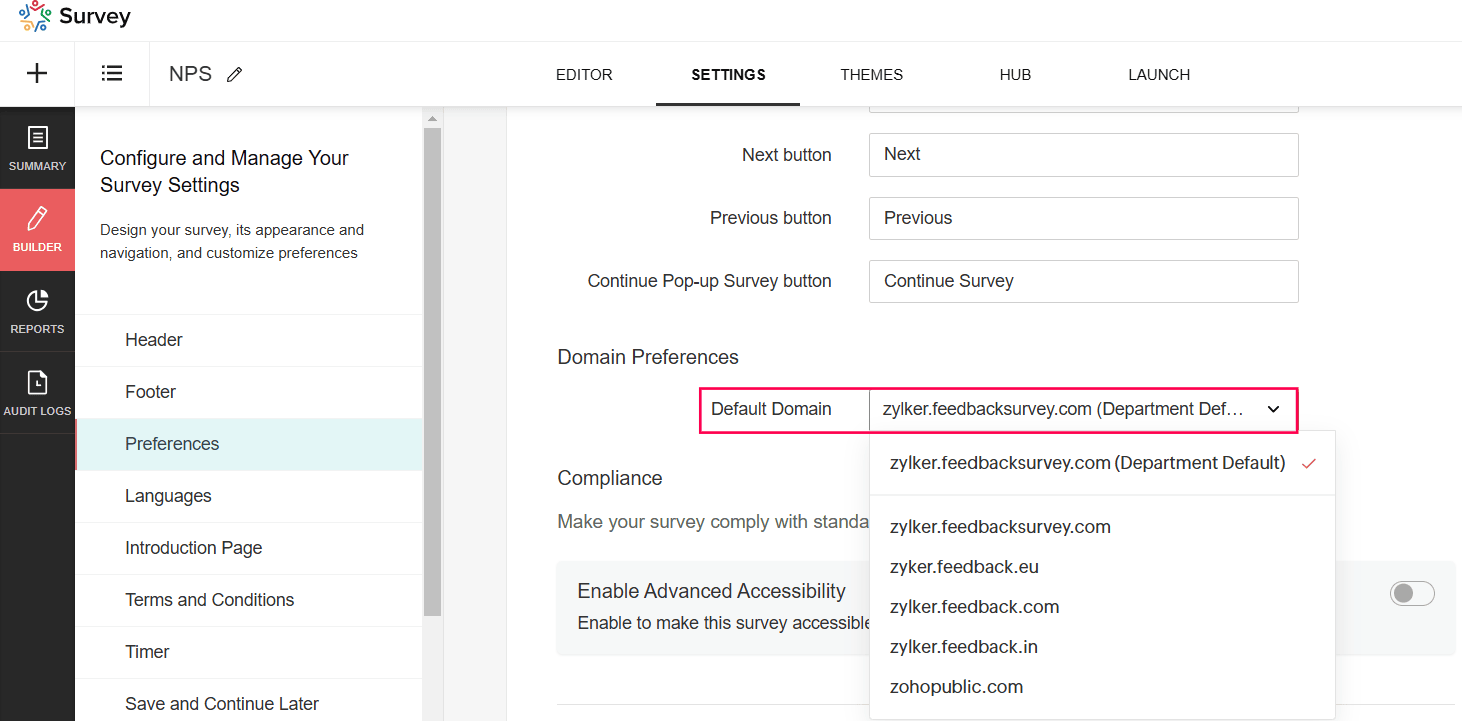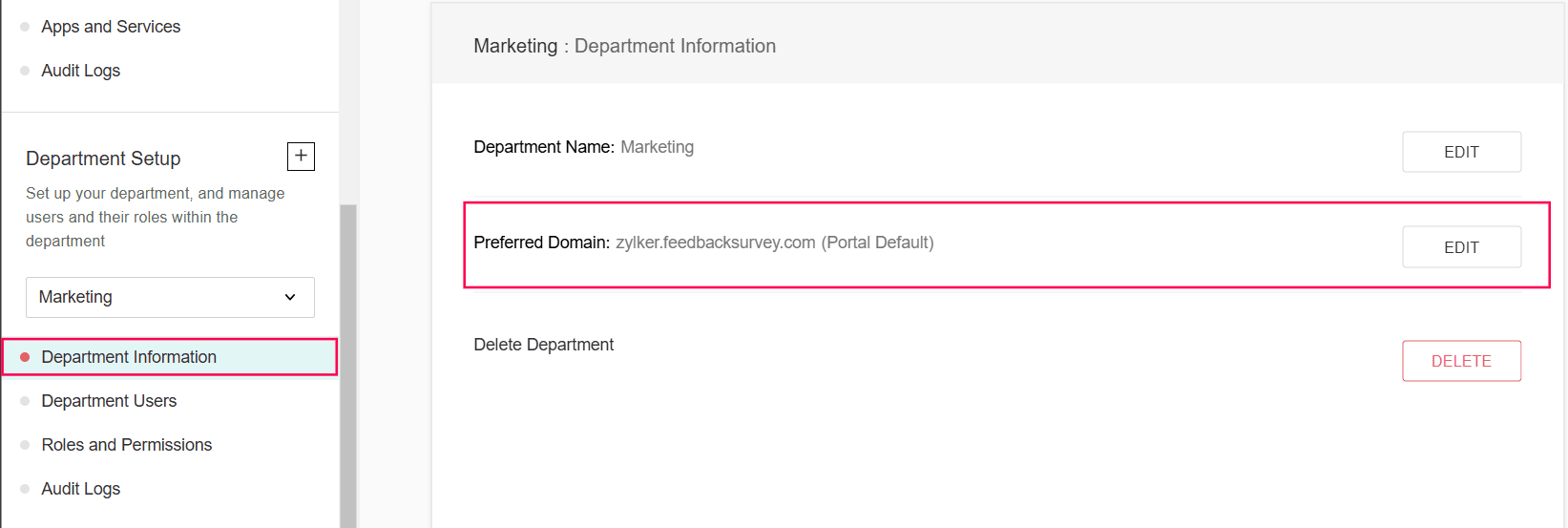 In Zoho survey, you can set the preferred domain at three levels, namely the portal, department, and survey level.