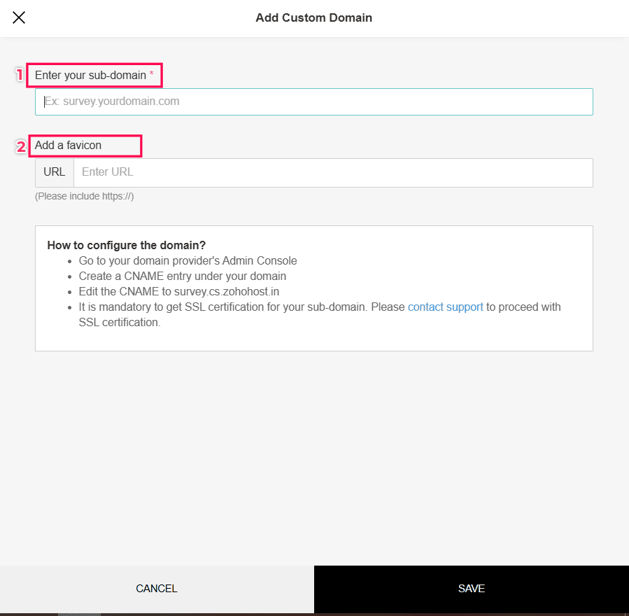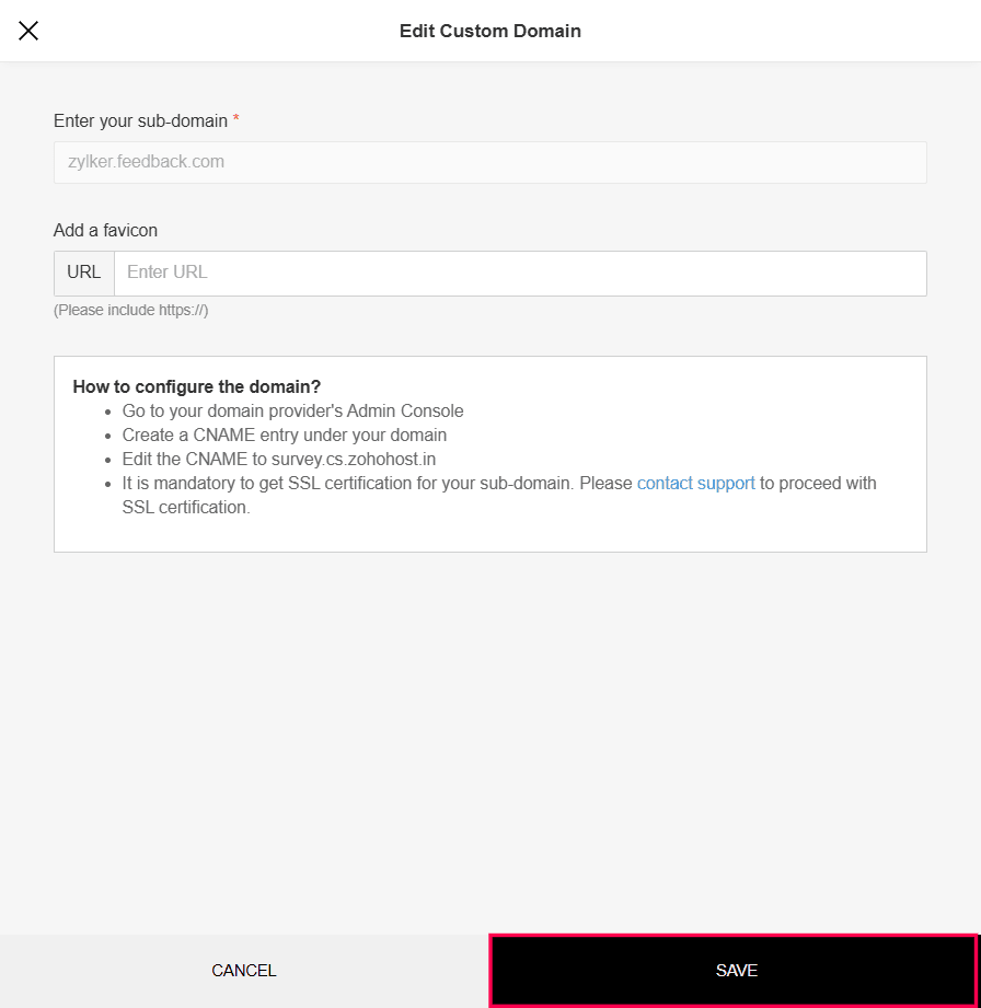 - Purchasing an SSL certificate is mandatory to make the domain changes live. Contact Zoho Survey Support to purchase the SSL certificate for your sub-domain free of cost.