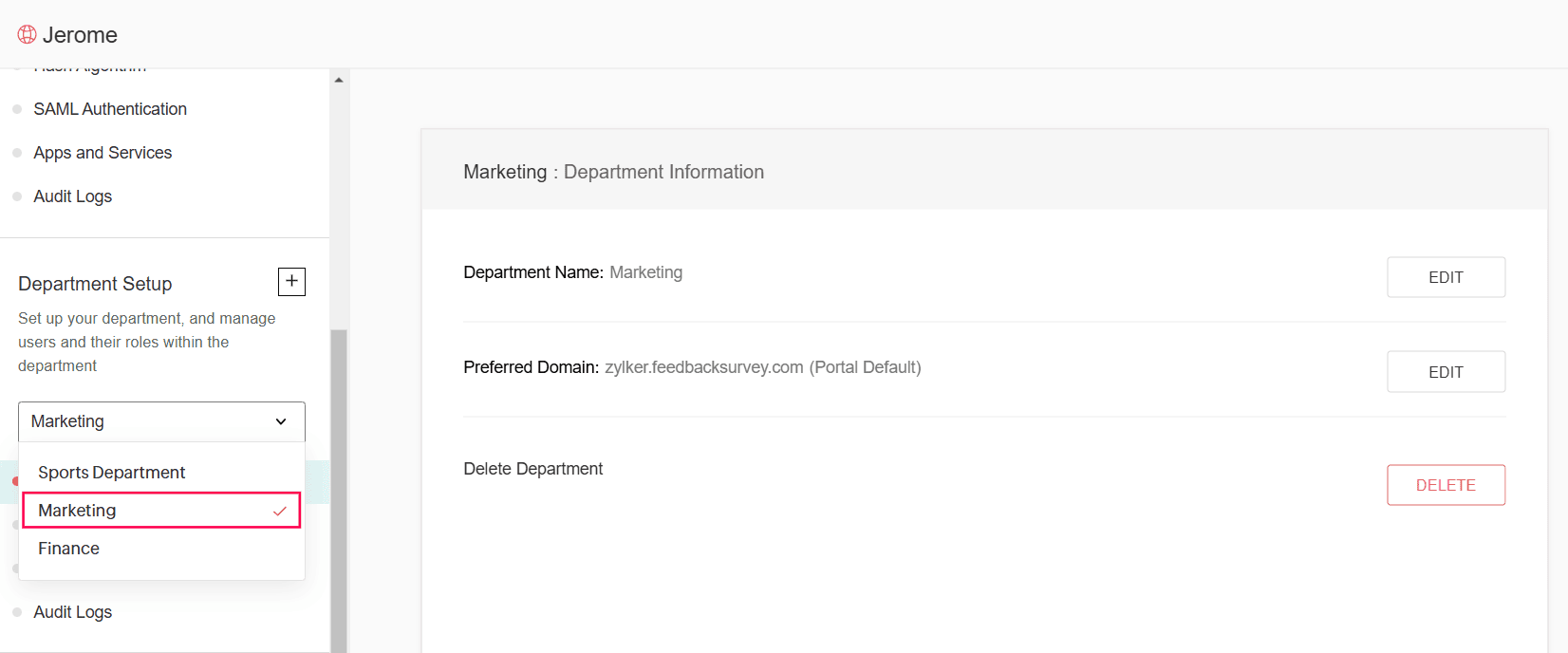 - Scroll down and navigate to Department Setup. If there are multiple departments, choose the department where you'd wish to set the preferred domain.