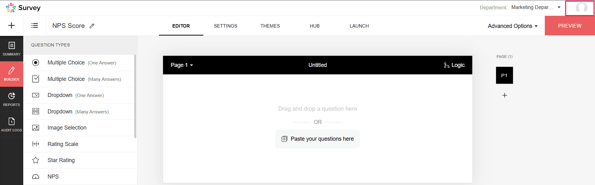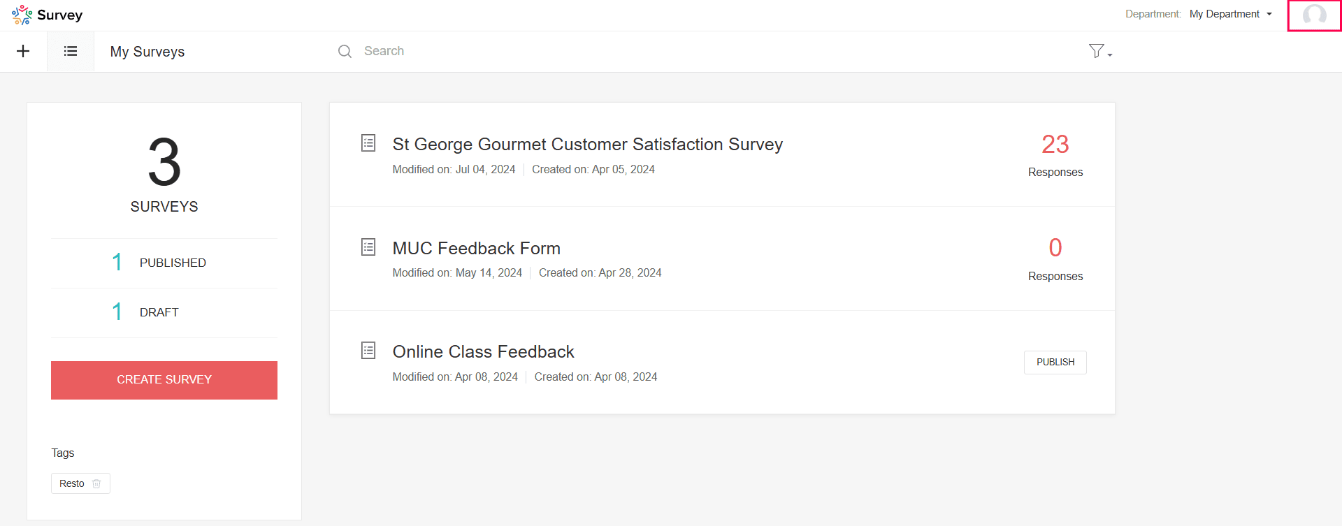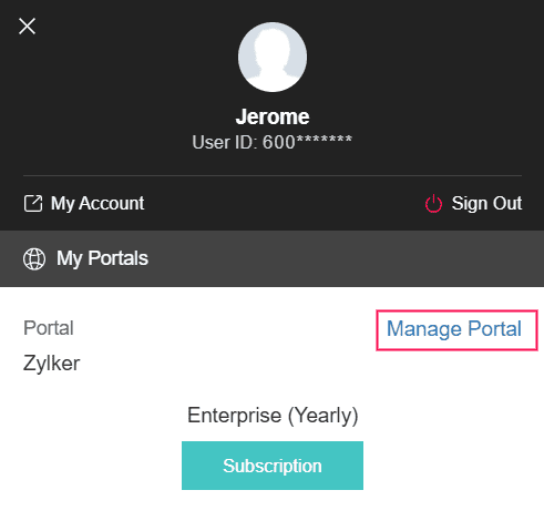 - Click on your profile icon at the top right corner of Zoho Survey and click on Manage Portal.