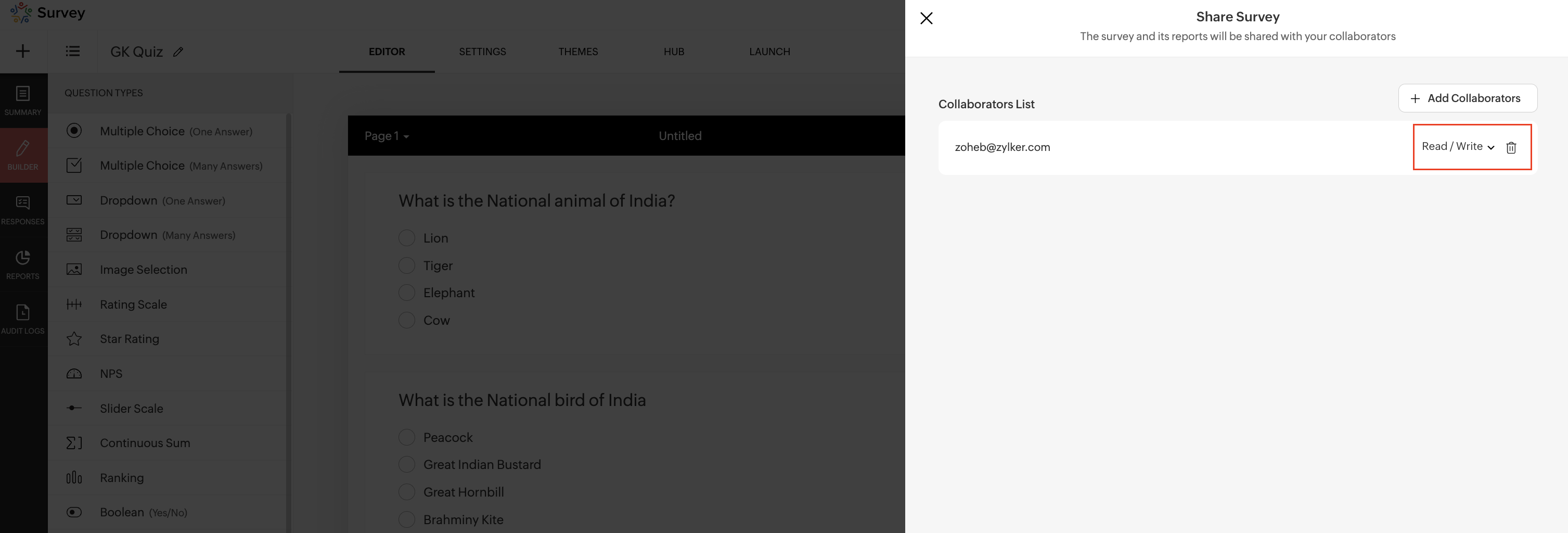 To modify the permission levels of a collaborator, hover over the access you want to modify in the Collaborator List and click on it.