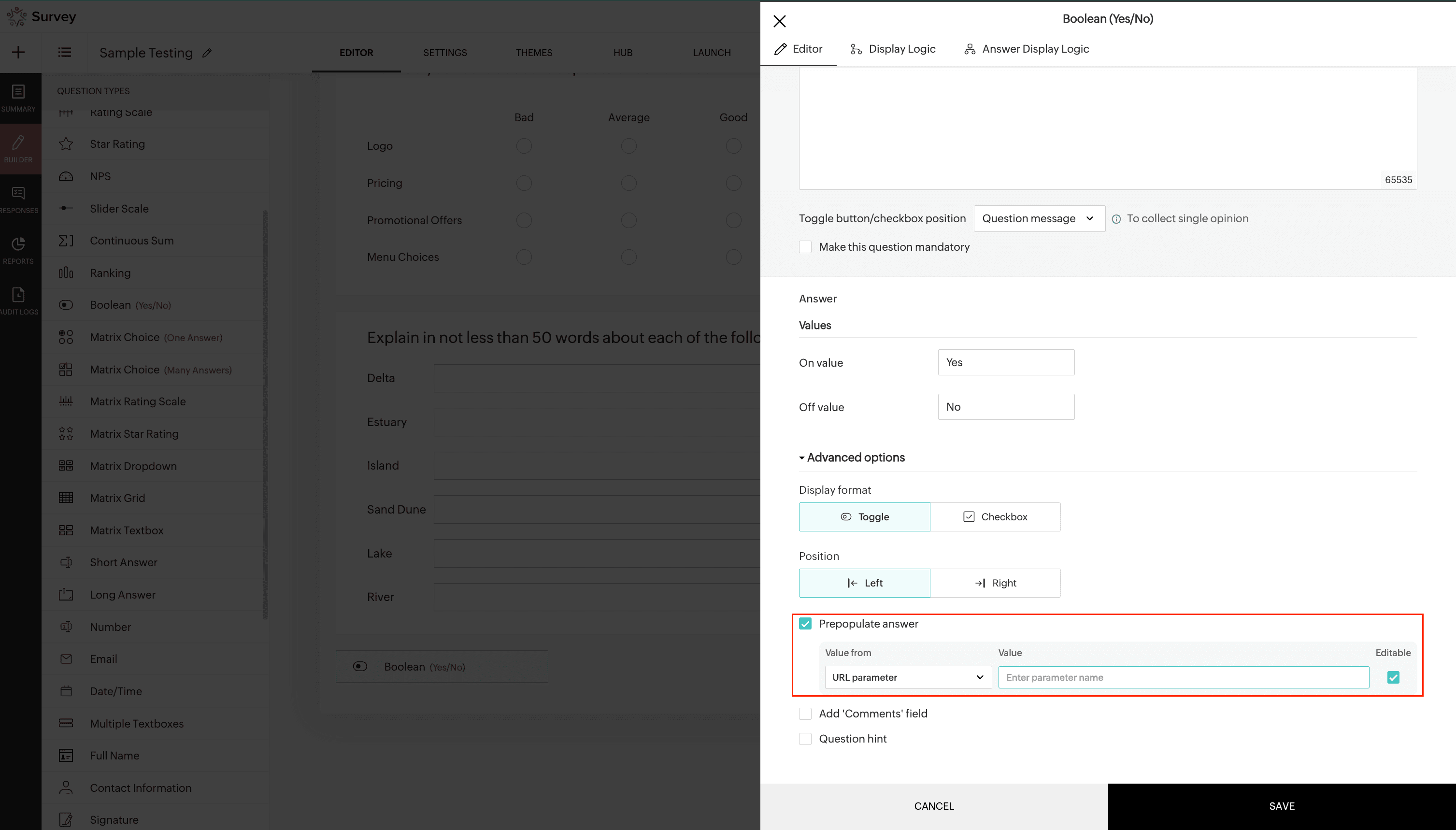 In addition, disable the Editable checkbox to restrict the responders from editing the pre-populated answer you have configured.