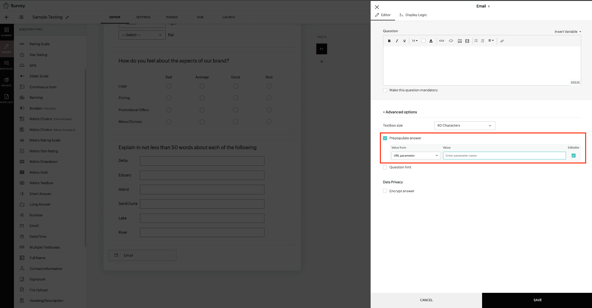 In addition, disable the Editable checkbox to restrict the responders from editing the pre-populated answer you have configured.