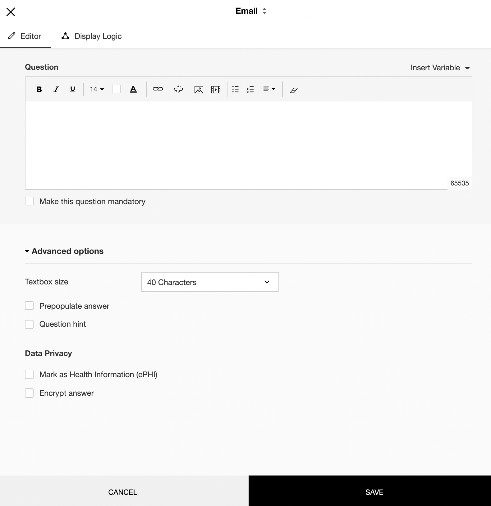 4. Switch to the Display Logic tab to add a logic condition to the question.