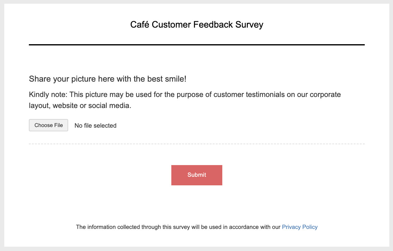 For example, you could add a file upload question in a cafe customer feedback survey to ask your customers to upload a picture taken at your cafe. This could later be used for showcasing their testimonials on your cafe website or social media pages.