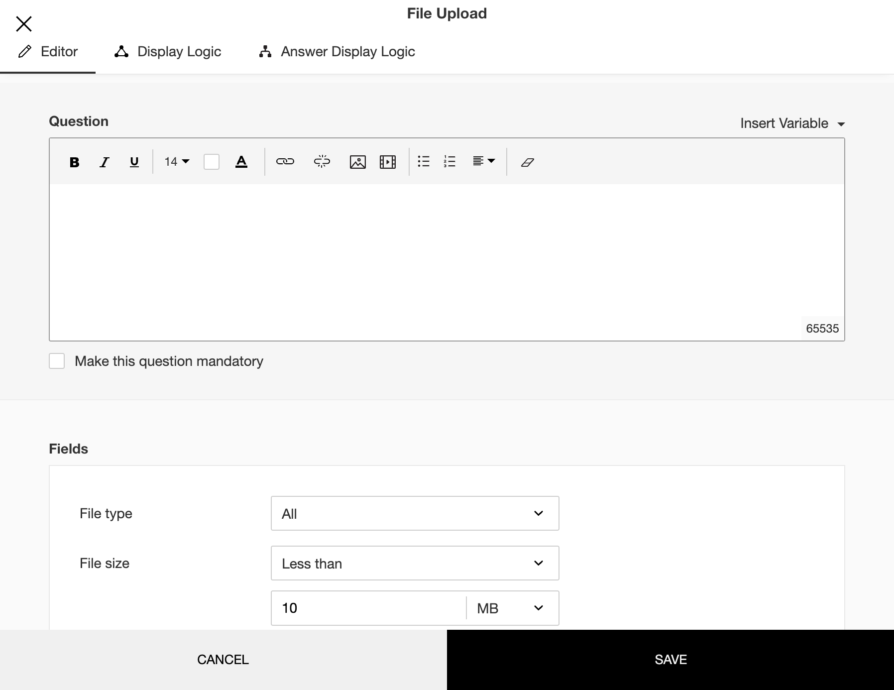 The File Upload question type enables respondents to upload files of any type to your survey.