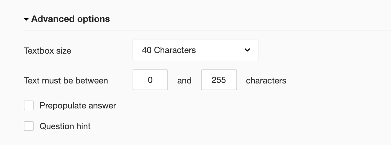 You can set the character limit and the textbox size (short answer, long answer, full name, or contact information) while crafting the question. The maximum response size is limited to 255 characters, which can be changed to any number less than 255. The maximum size you can set for the text box is 40 characters.