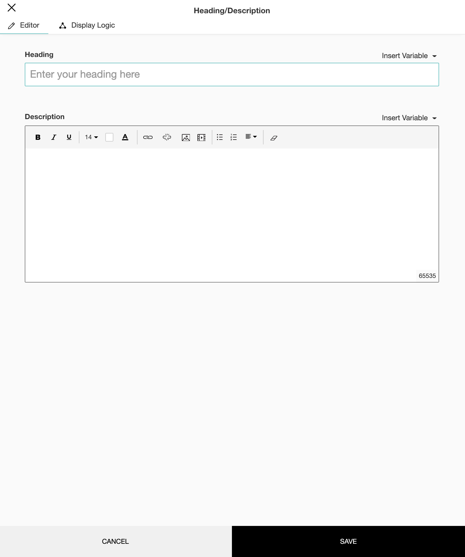 1. If you want to pipe in custom variables or variables from previous questions and customize the follow-up questions, click Insert Variable right above the  Description box, and select the variable you want to use from the list. Read more on Piping