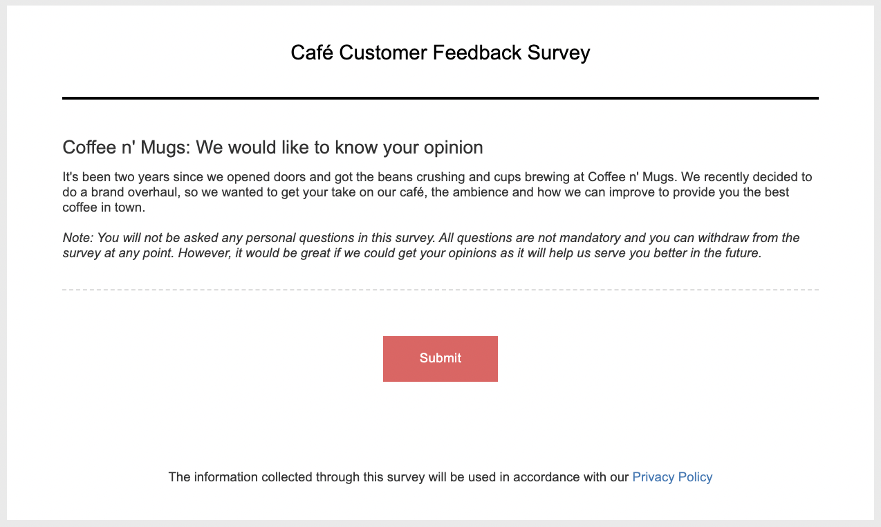 For example, you could use the heading/description question in your cafe customer feedback survey to tell your customers what the survey is all about.