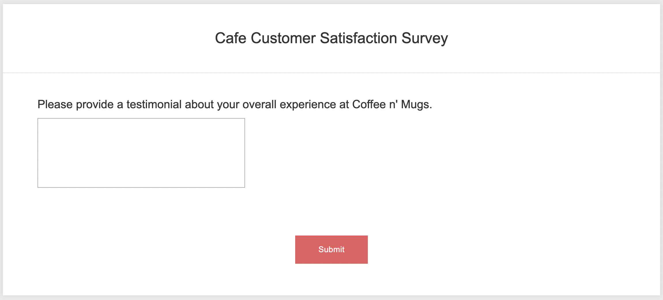For example, if you need to showcase a customer testimonial on your cafe website, you'd definitely like your customers to explain quite a bit about their visits to your cafe and the experiences they had there. A long answer question would be ideal for them to talk about everything in detail.