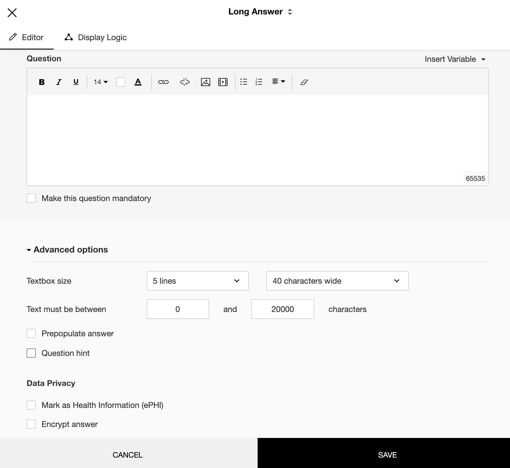 The Long Answer question type allows your respondents to write long, open-ended answers in a textbox. You can set the character limit and the textbox size in the advanced options section. The maximum response size is limited to 5000 characters, which can be changed to any number less than 5000. The response textbox size can be formatted to allow up to 9 lines with 100 characters for each line.
