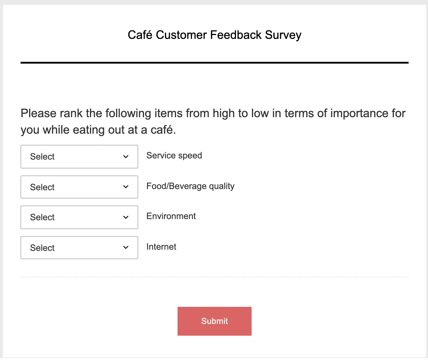 The Ranking question is similar to rating scale, but it also helps respondents to compare a list of items and rank them in their order of preference.