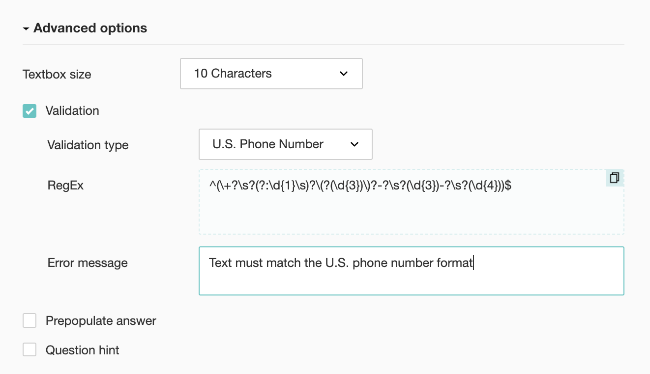 2. Select Validation if you would like to validate your responses using a predefined or custom regular expression that matches the answer.
