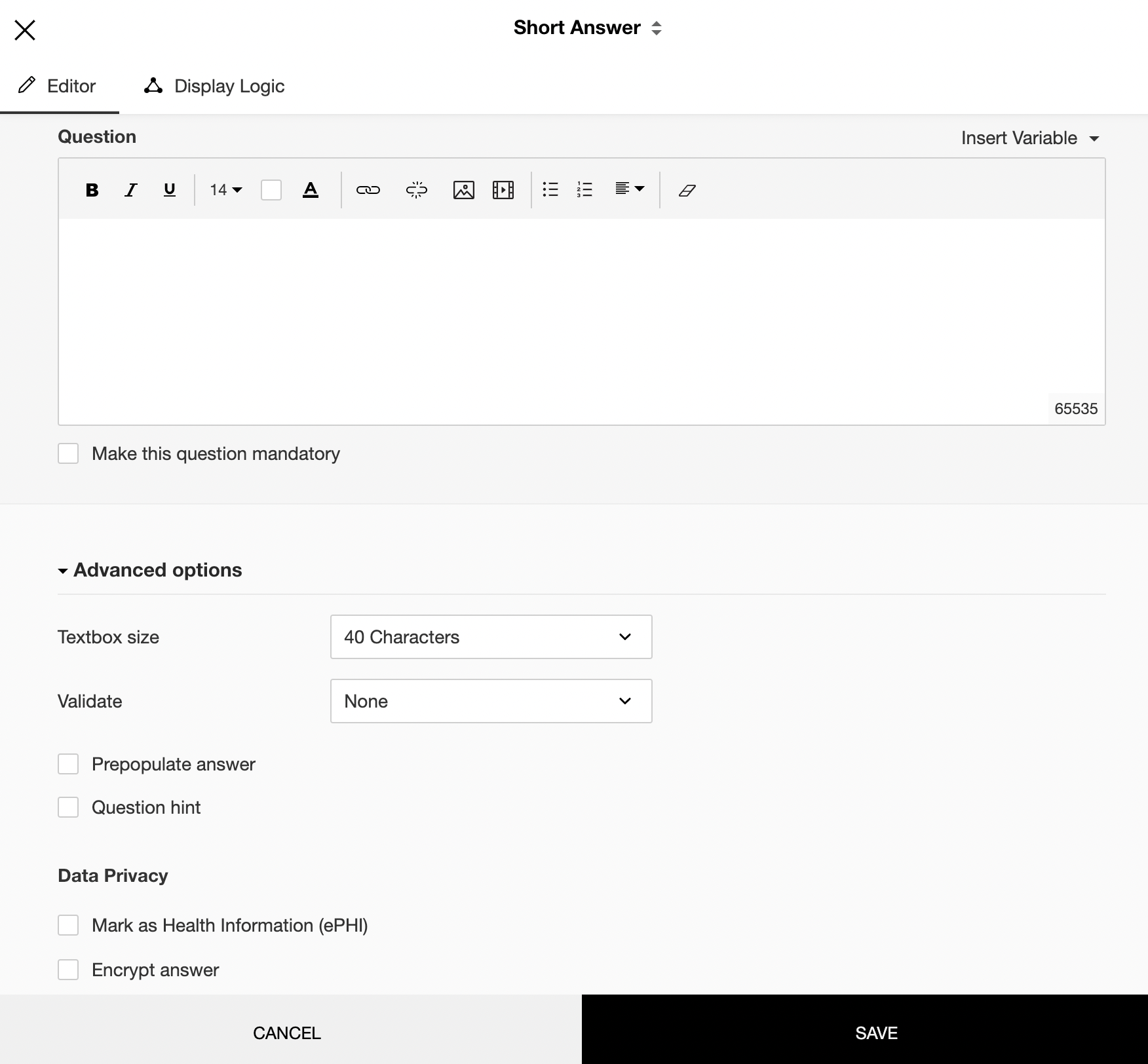 4. Switch to the Display Logic tab to add a logic condition to the question.