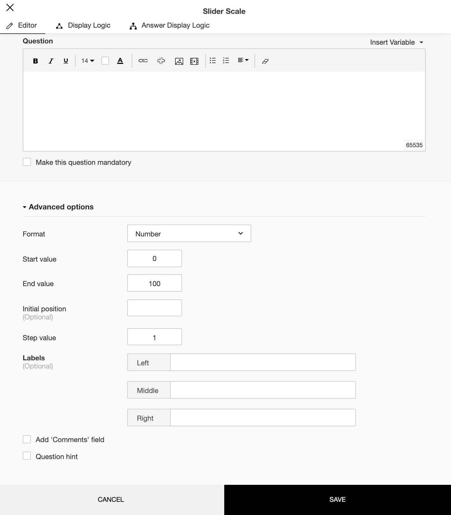 6. Labels - If you want to name the left, middle, and right labels of the slider scale, type in the label names in the respective boxes.