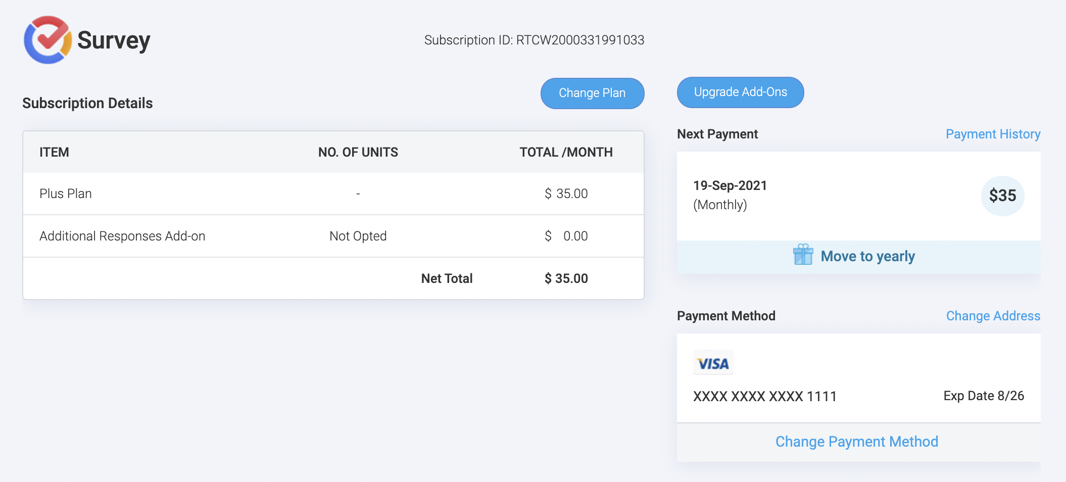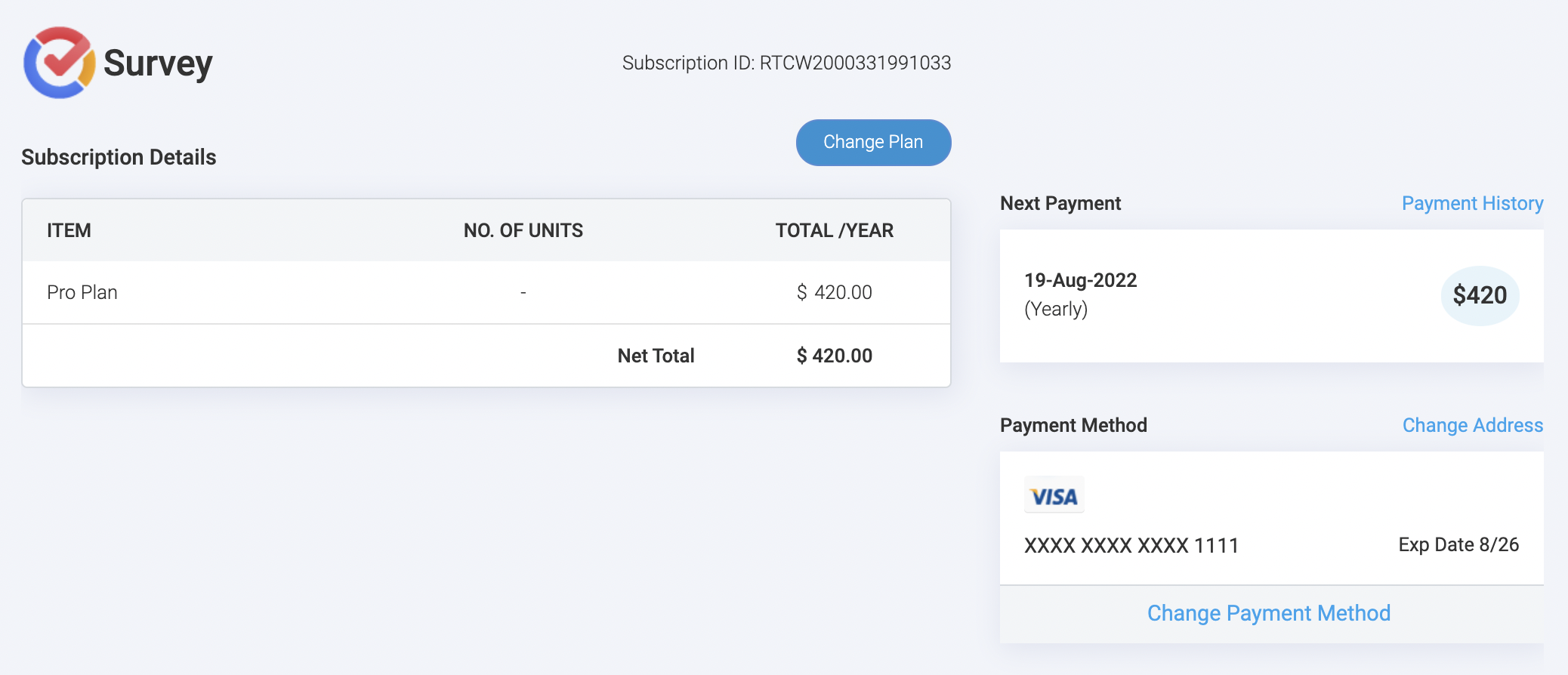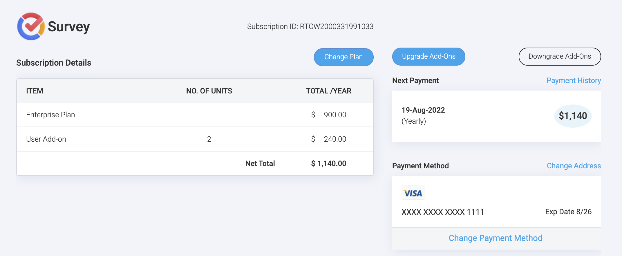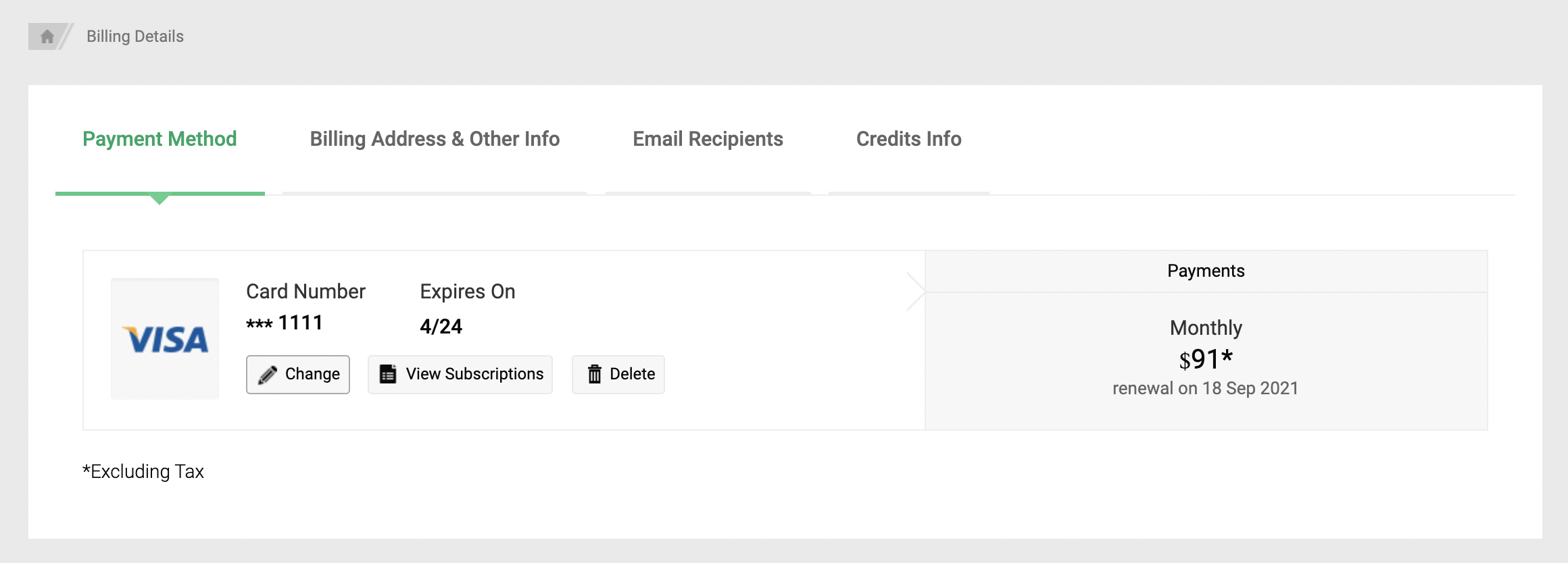 You can click View Subscriptions on the same page to view your current active subscription. You can also add email recipients for any payment-related updates by clicking Email Recipients and then Add Recipient.
