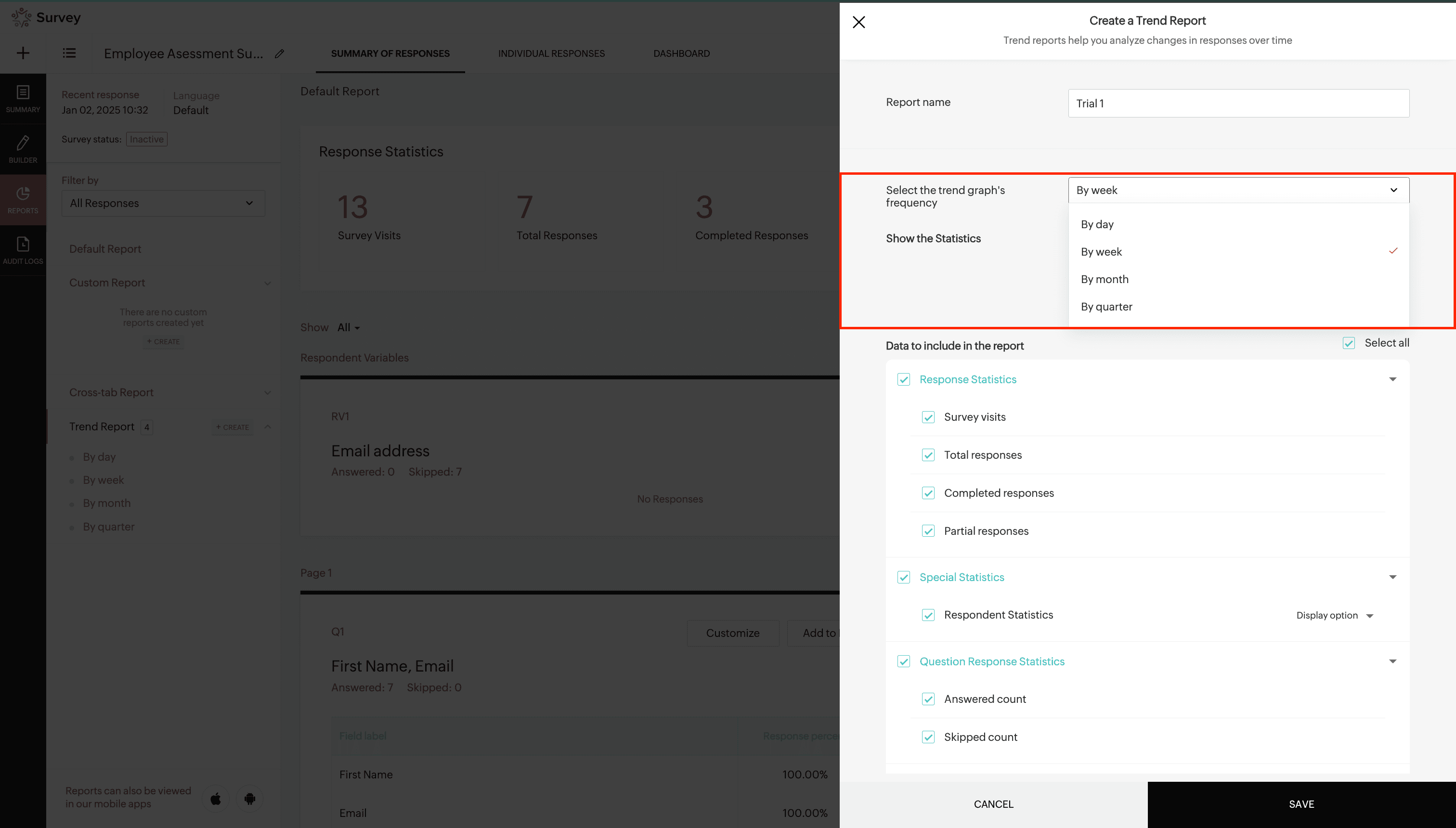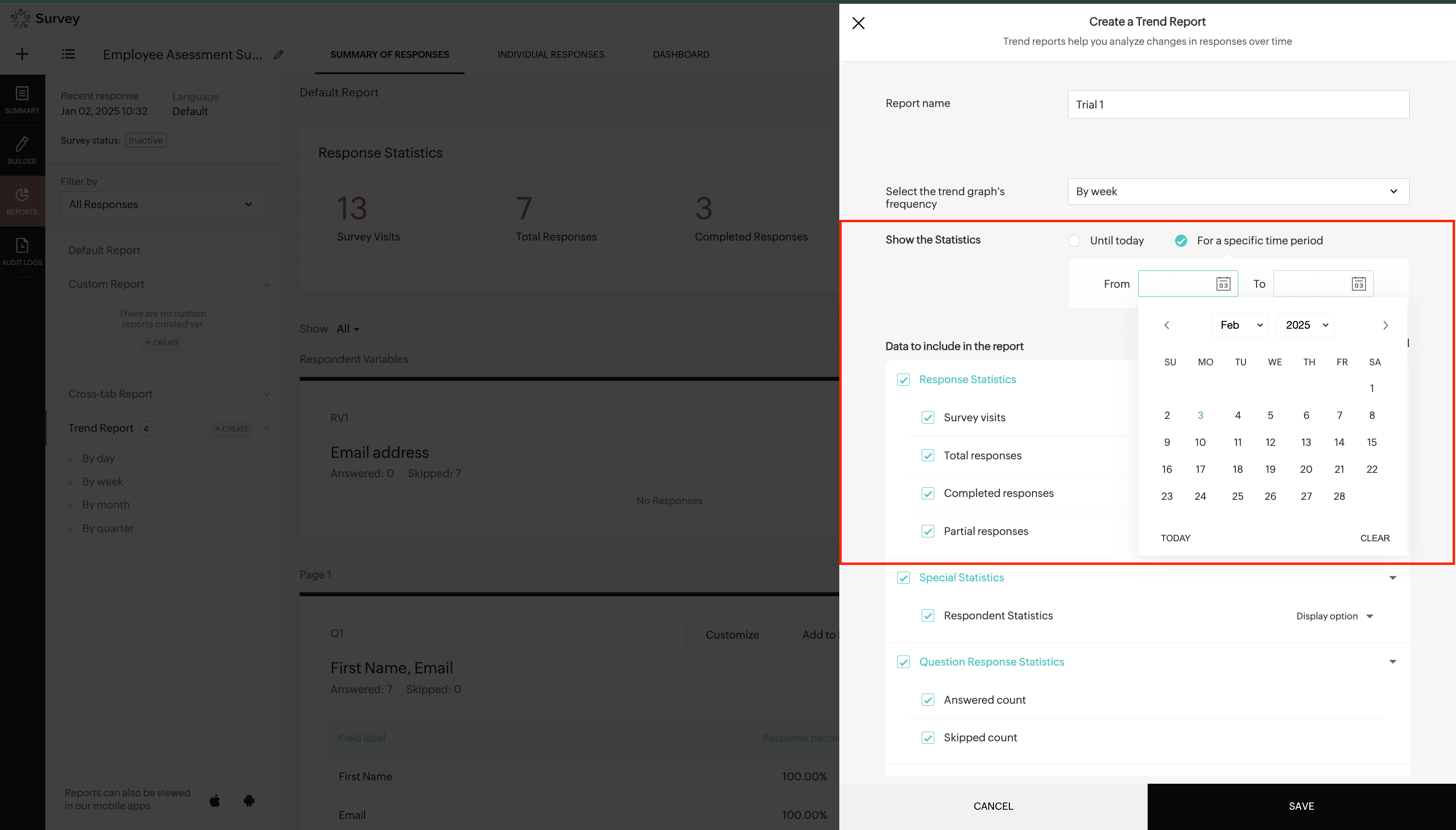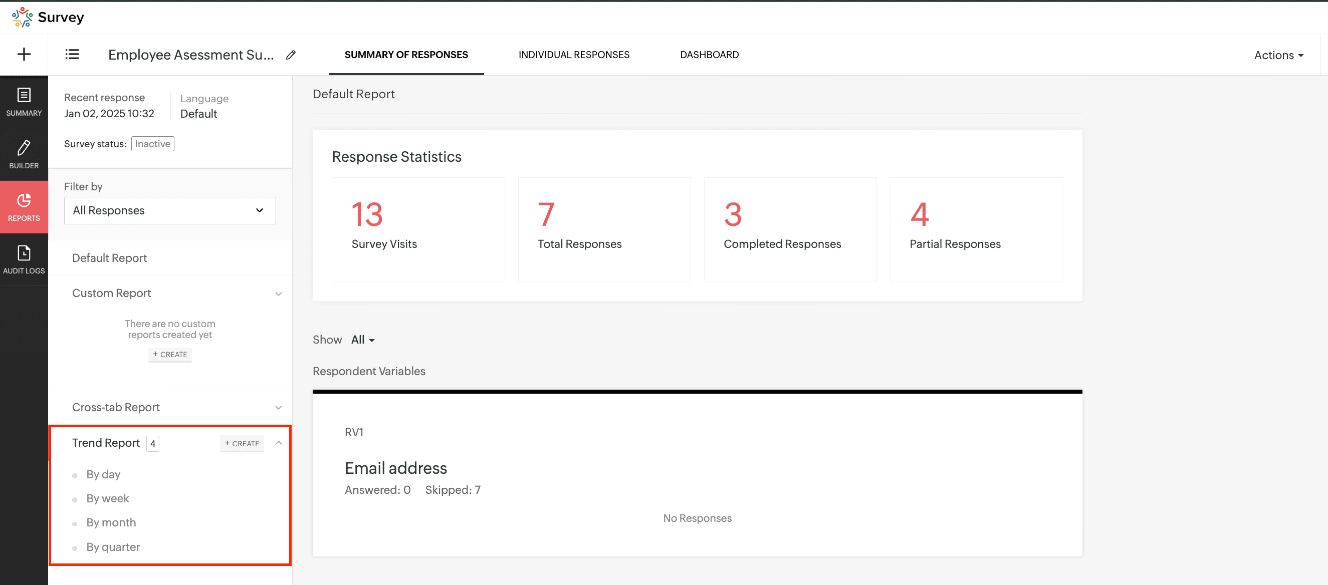 Create trend reports to analyze data over a specific period. Let's look at how to create a trend report with the Zoho Survey.
