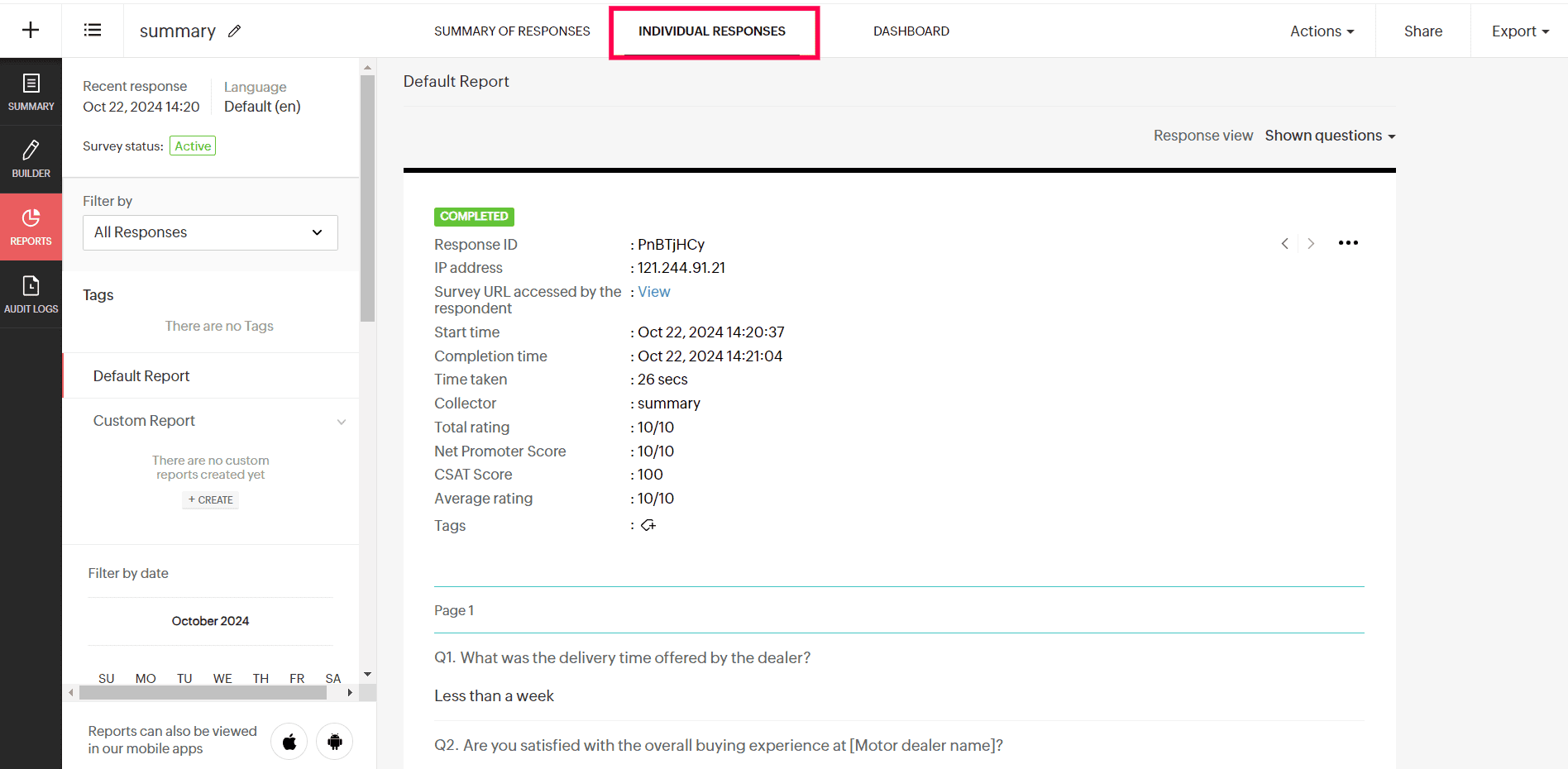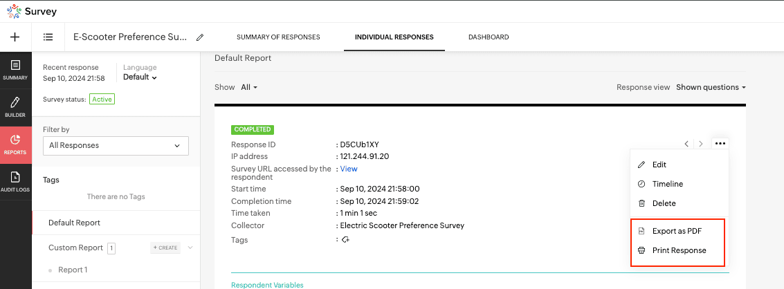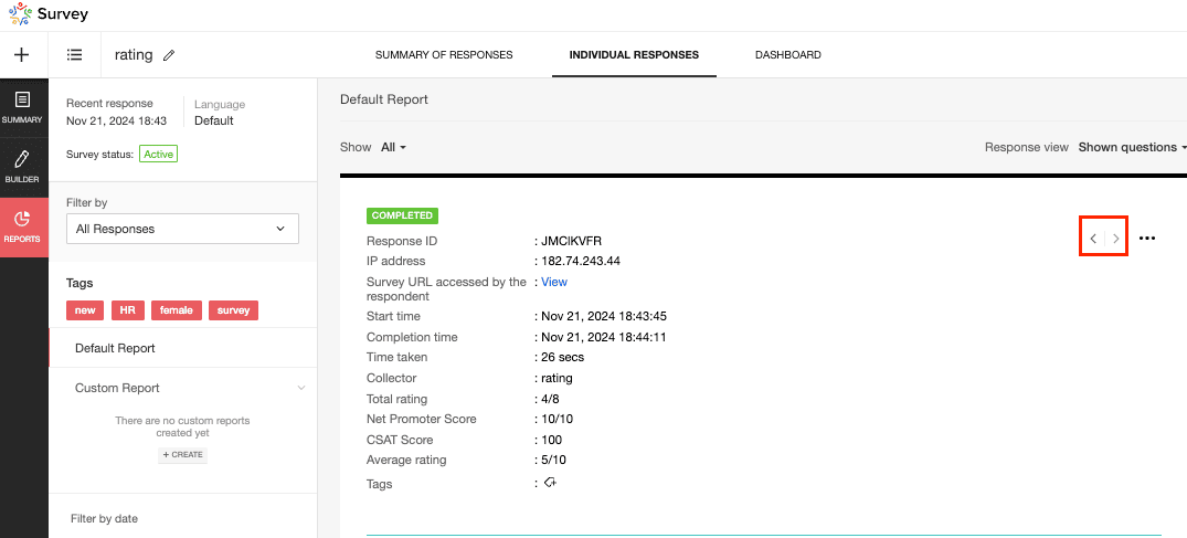 The Individual Responses section provides a detailed breakdown of each respondent's answers to your survey questions. Here, you’ll find comprehensive information, including the respondent’s IP address, the date and time of their submission, how long they took to complete the survey, and the average rating they gave. If any questions were left unanswered, they will be marked as Skipped. Additionally, custom variable data, and respondent variable data gathered from Email Distribution, Zoho CRM, Zoho Campaigns, SMS Distribution, Unique URL generator, Zoho Survey Extension for Zoho Desk, and Unique parameter names will be displayed.