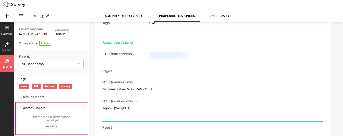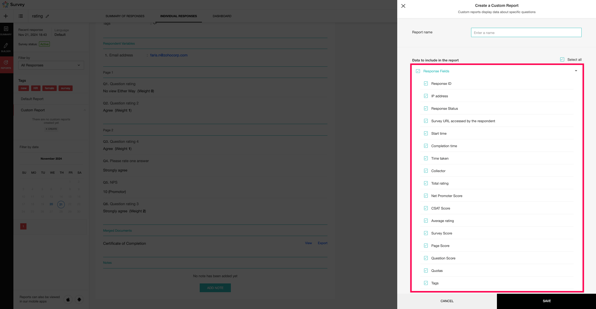 Give your report a name and select the parameters to be included in your custom report for the individual response chosen.