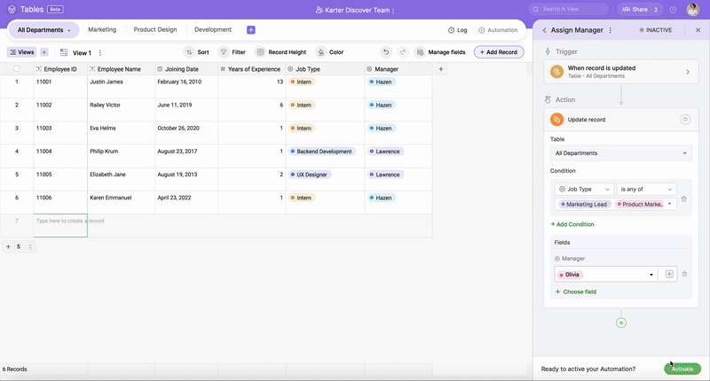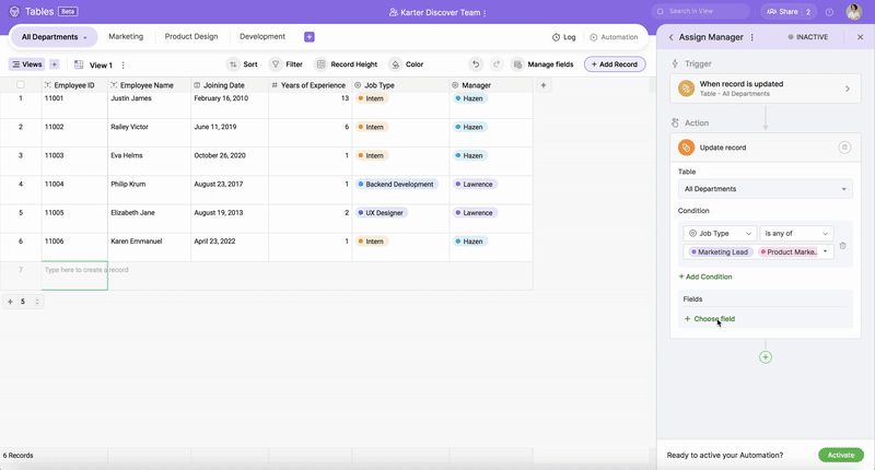 In the below example, as part of our job delegation process, we want to update the department manager's name based on the assignee's job type.