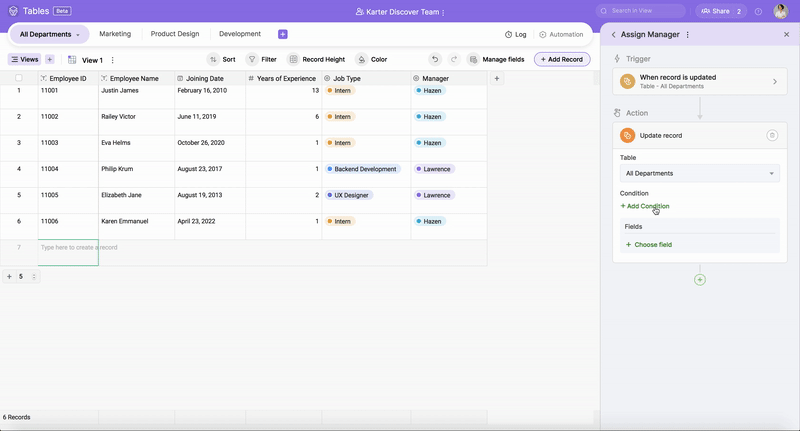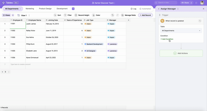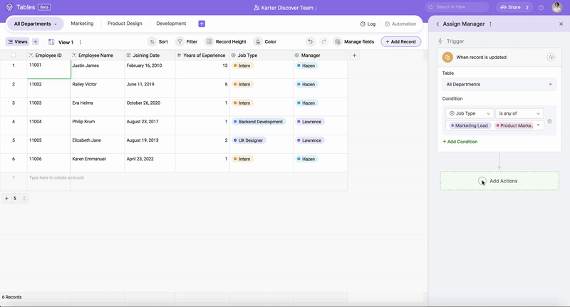 a) Click + Add Actions and choose the action Update record. Choose the table All Departments where you want to update the record.
