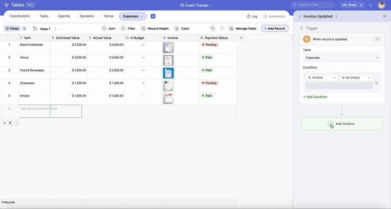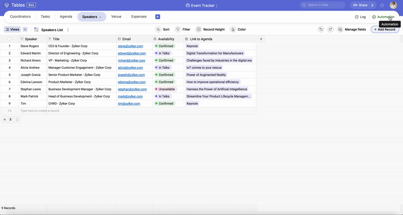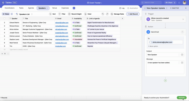 For example, you want to inform the event manager via email every time a new speaker (new record) is added to the Speakers table under the Event Tracker base.