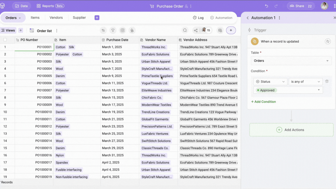 For instance, you intend to send an email to the assignee of an order, "when a record is updated with the status, 'approved'" under the Orders table.