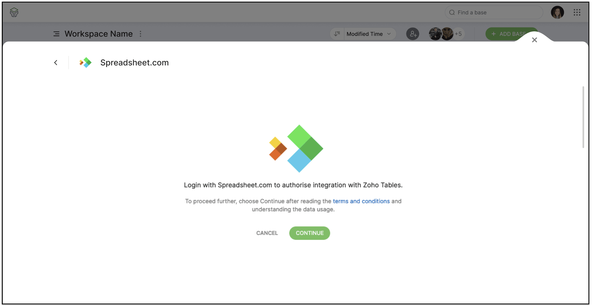 You’ll be shown a confirmation to connect your Spreadsheet.com account with Zoho Tables. Click CONTINUE.