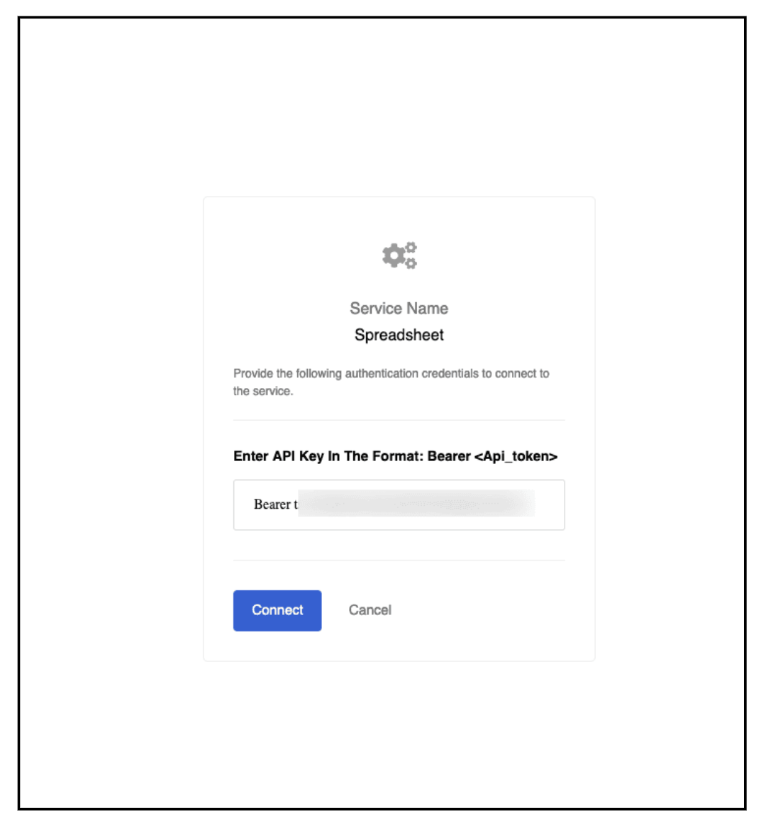 After confirmation, you'll be redirected to the Authentication page, where you'll need to enter the API key from Spreadsheet.com.