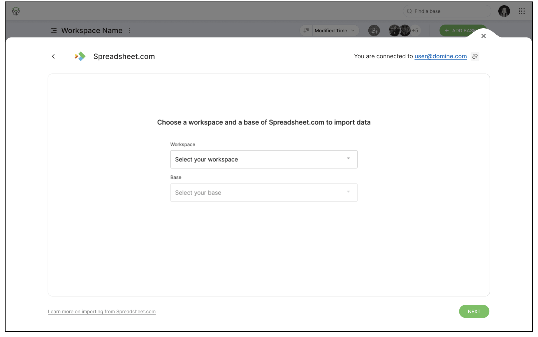The bases in the chosen workspace will be listed in the dropdown menu for you to choose from. Once you've chosen the workspace and the base you want to import, click NEXT.
