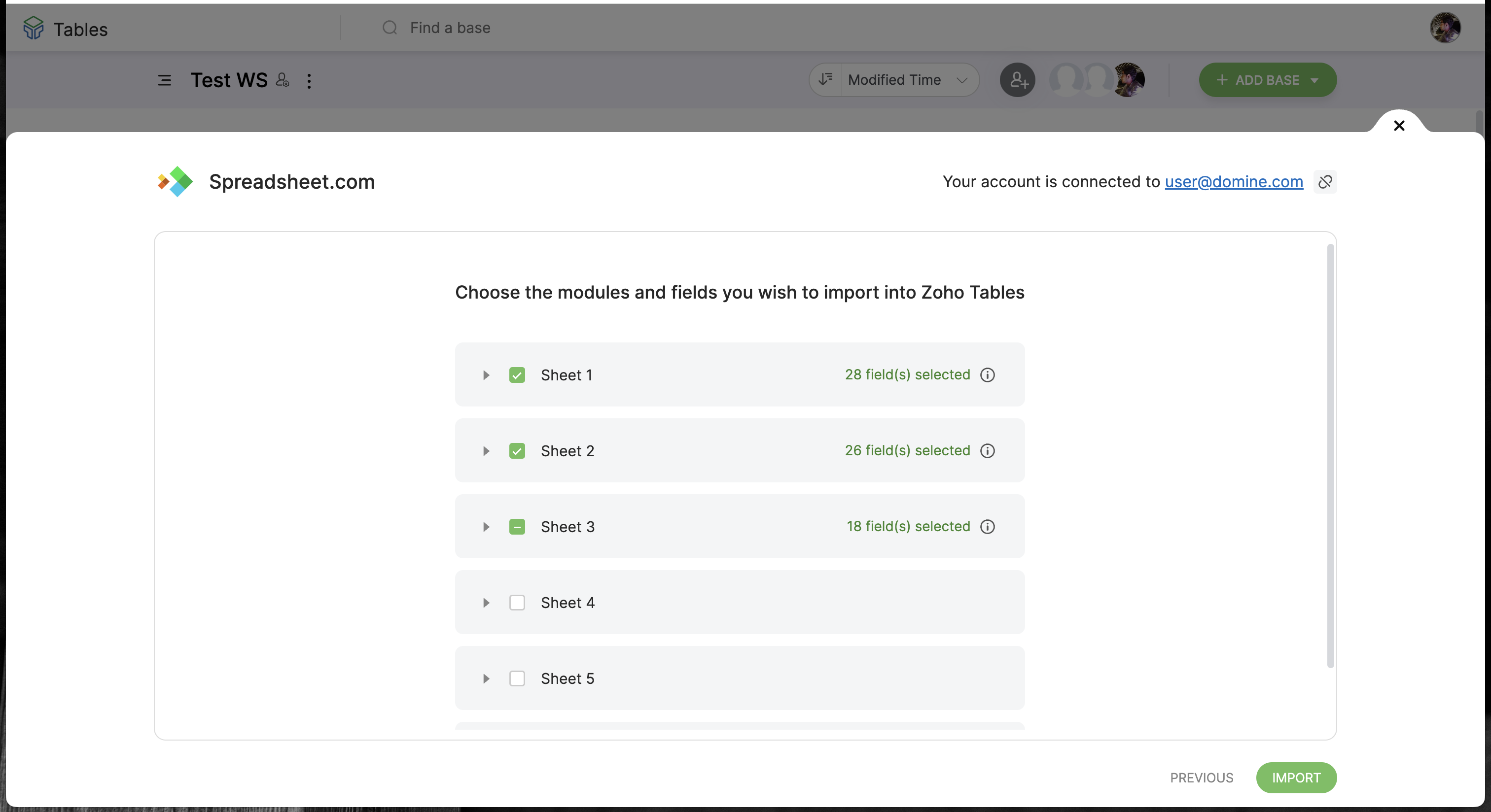 After choosing the desired modules and fields, click Import. This will import the selected fields from every module in Spreadsheet.com to a new base in Zoho Tables.