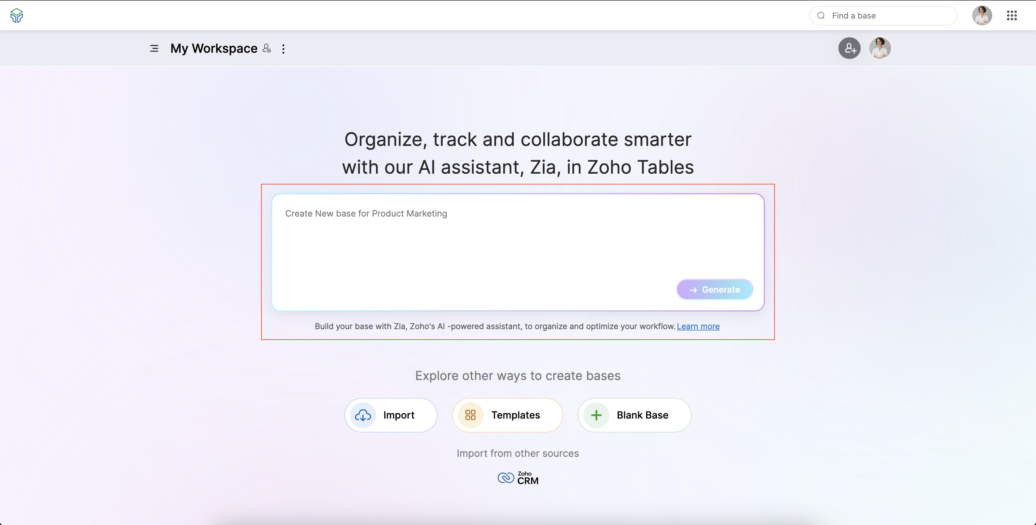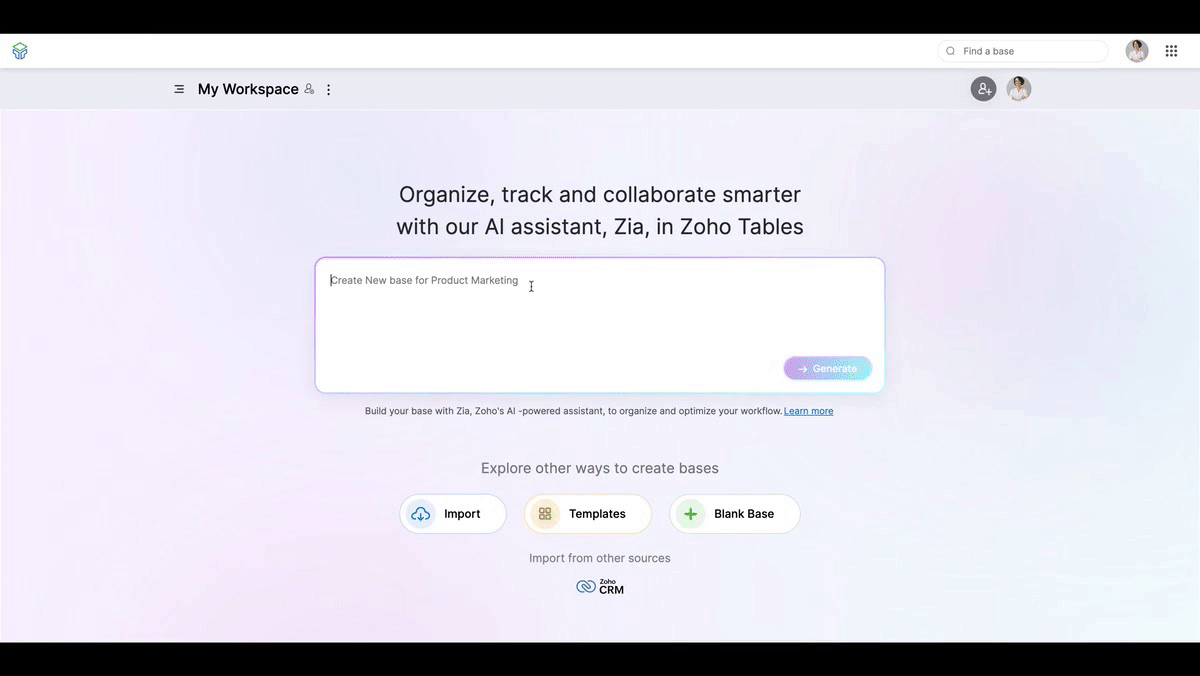You can create customized bases that suit your workflow with just a simple prompt using Zoho's AI-powered assistant, Zia.