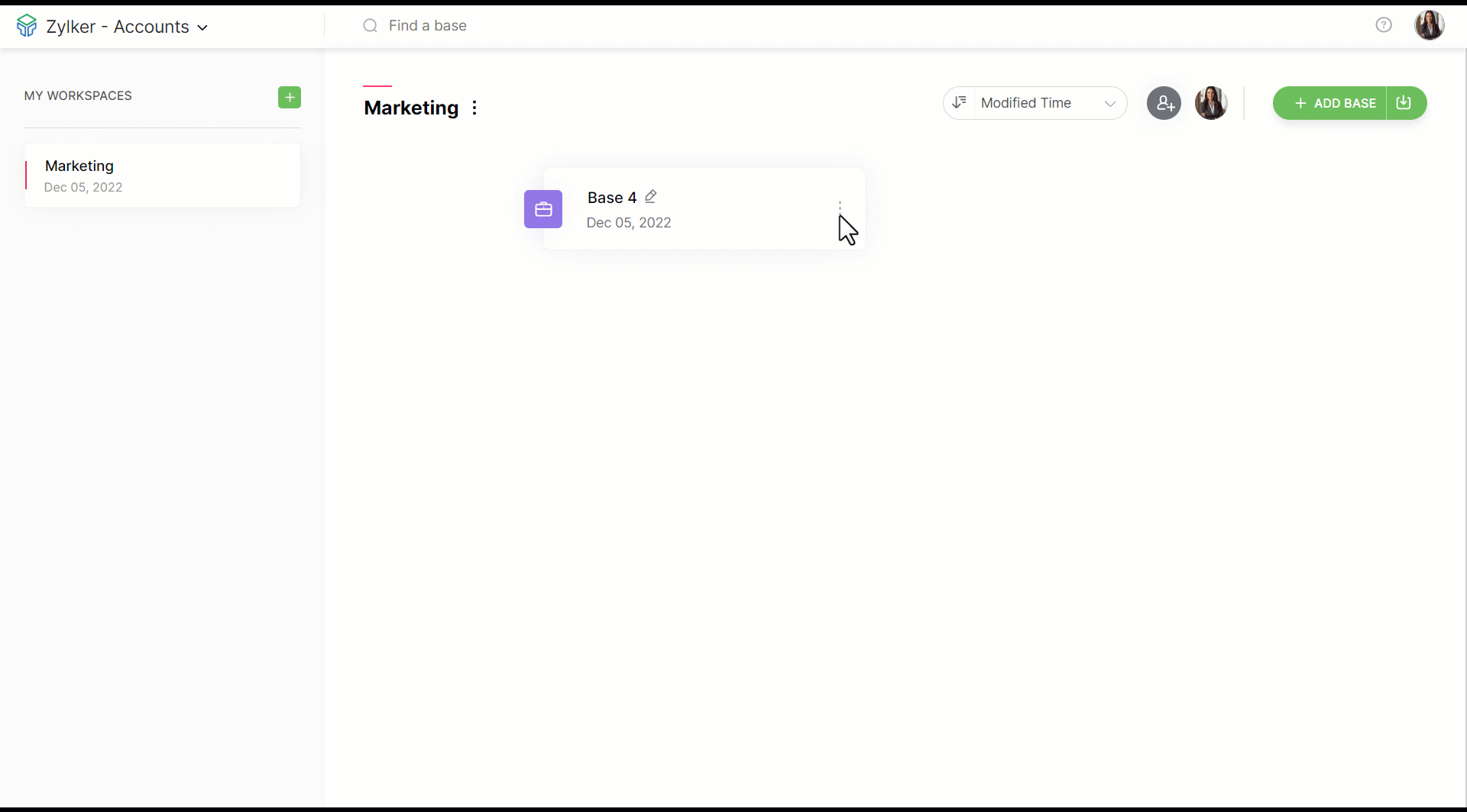1. From the base listing page, click the three dots (More Options) next to the name of the Base.