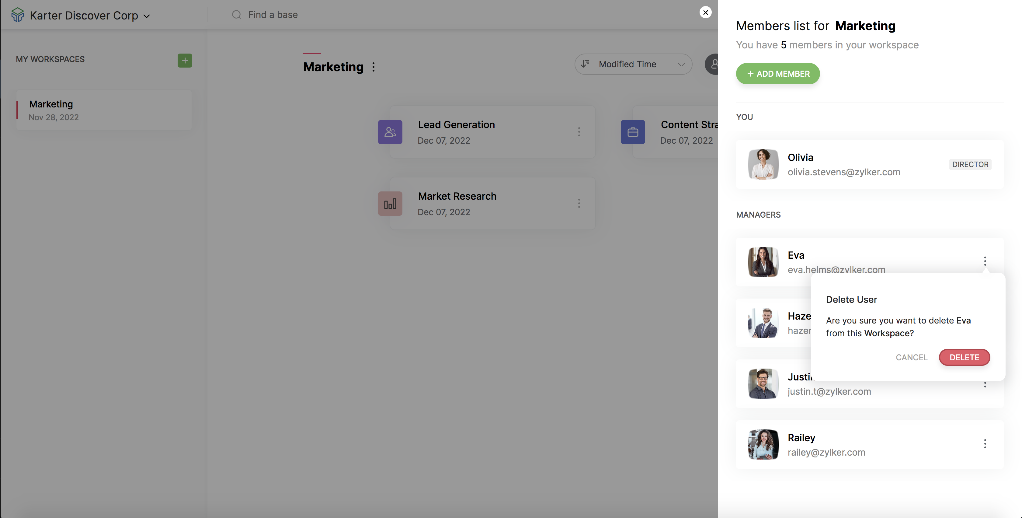 Anyone with the capacity to manage roles can remove the user from your Workspace. To remove a user from the Workspace, go to the Workspace Listing page and click the Workspace members option. You can see the list of users in your Workspace, select the More Options button near the user you want to delete, and click the Delete option.