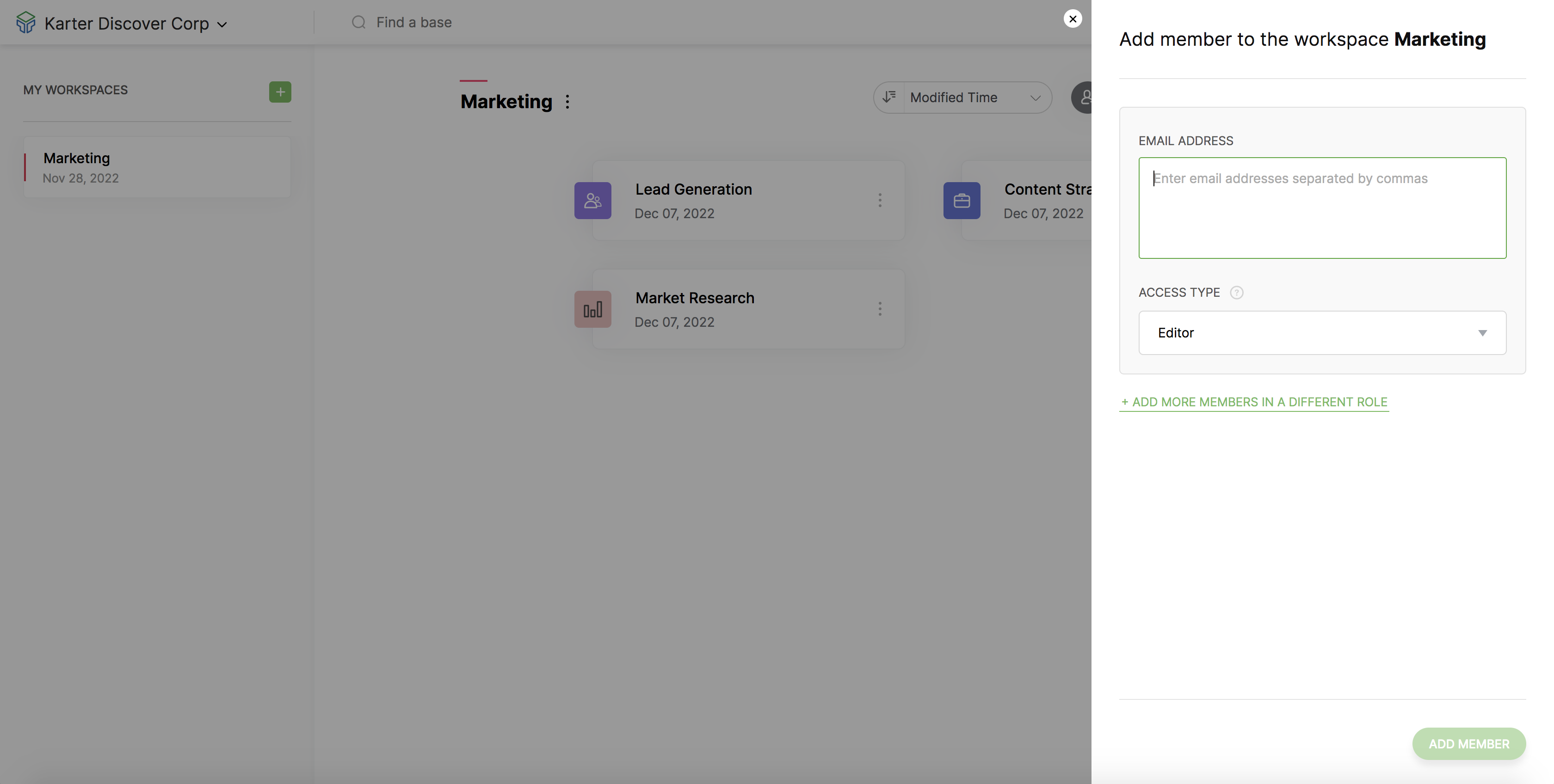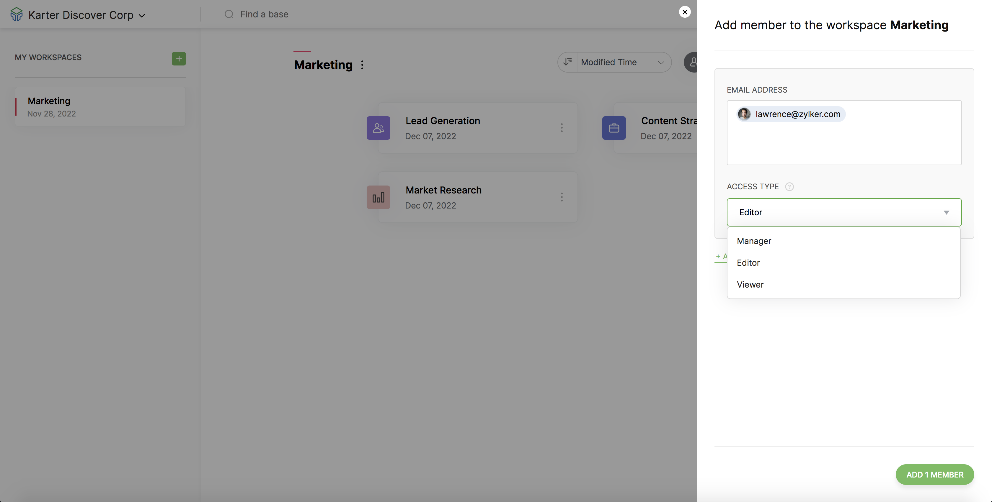 If you wish to add members to your Workspace rather than your Portal, use this option. From the Workspace listing page, click the Add Member icon. You can set up roles in your Workspace. Three types of access are available that you can set to your users: Manager, Editor, or Viewer.