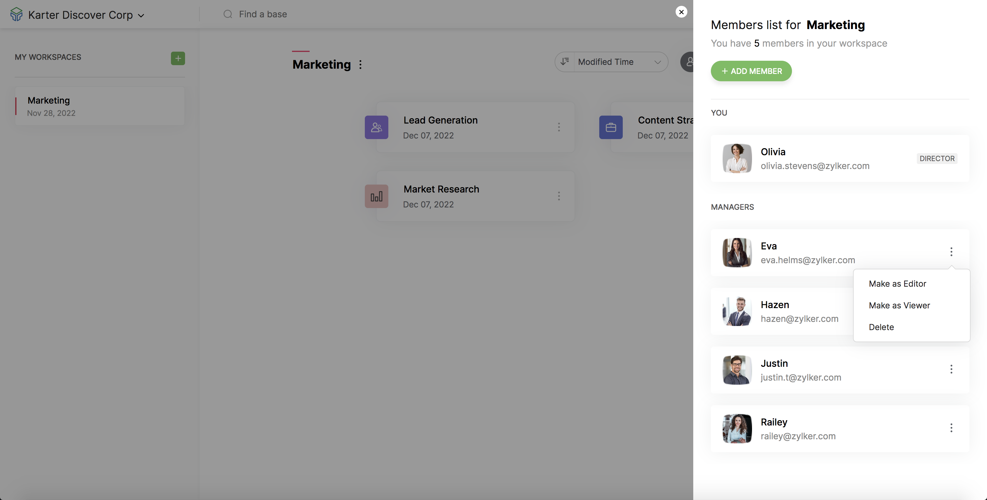 You can add users that are part of your organization to your Portal/ Workspace/Base based on the access permission which you deem fit for them. If you want to work with someone within Zoho Tables, you can add someone to the Portal, Workspace, or the Base as a Manager, Editor, or a Viewer. A manager has access to all of the bases in a workspace, while an editor has access to only the bases shared with them within a workspace.
