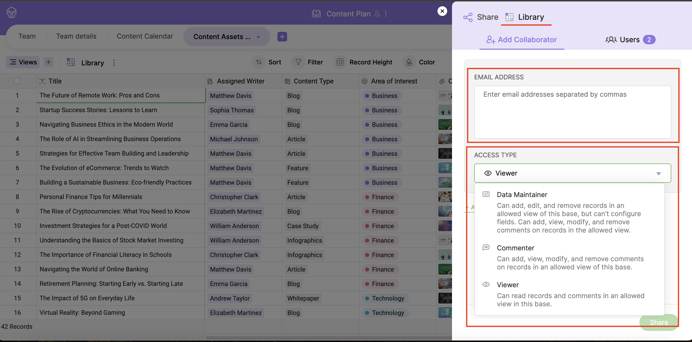 Choose the access level you want to grant to the chosen collaborators from the Access Type dropdown menu. The different access types that can be chosen for collaborators include: