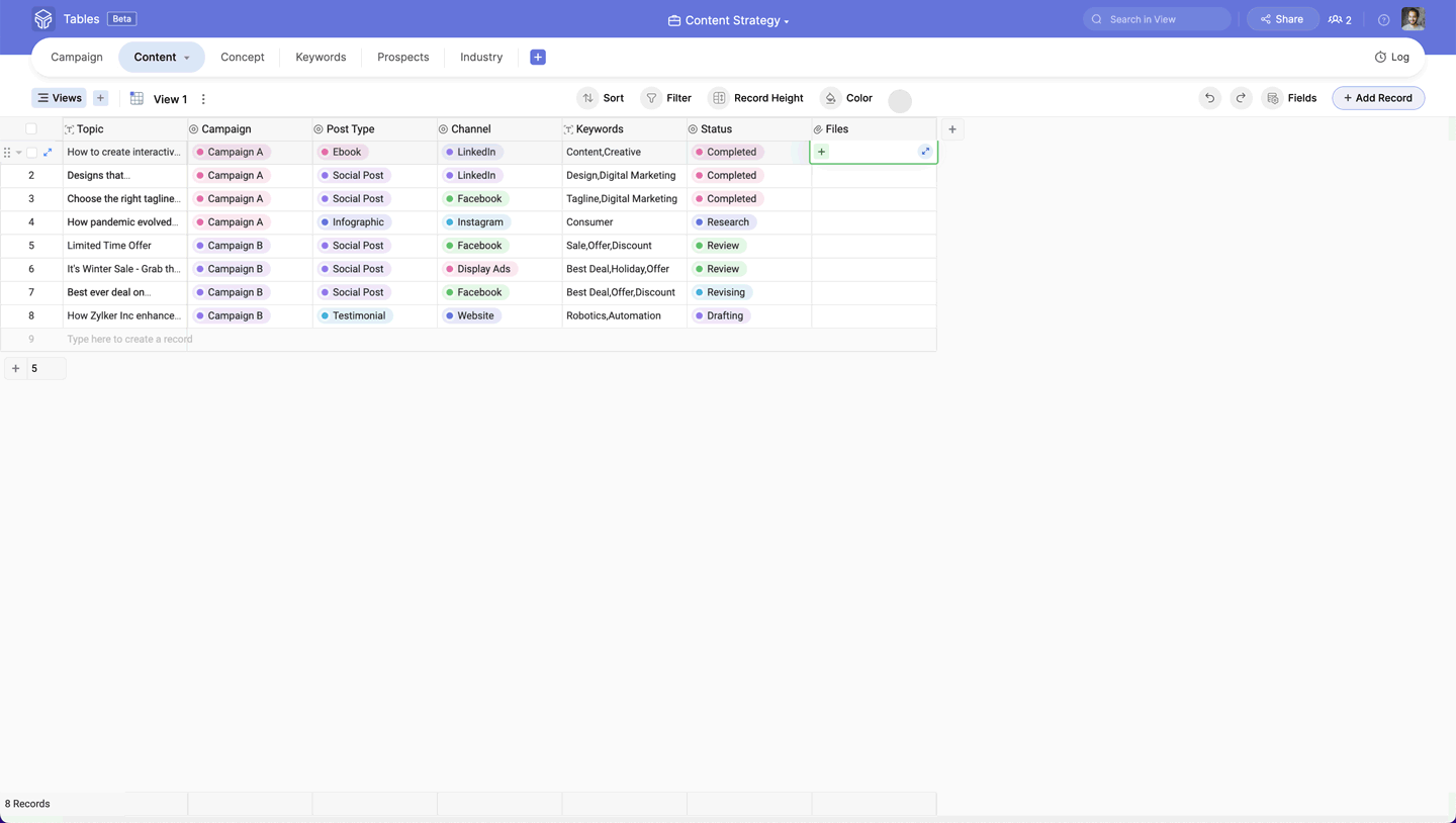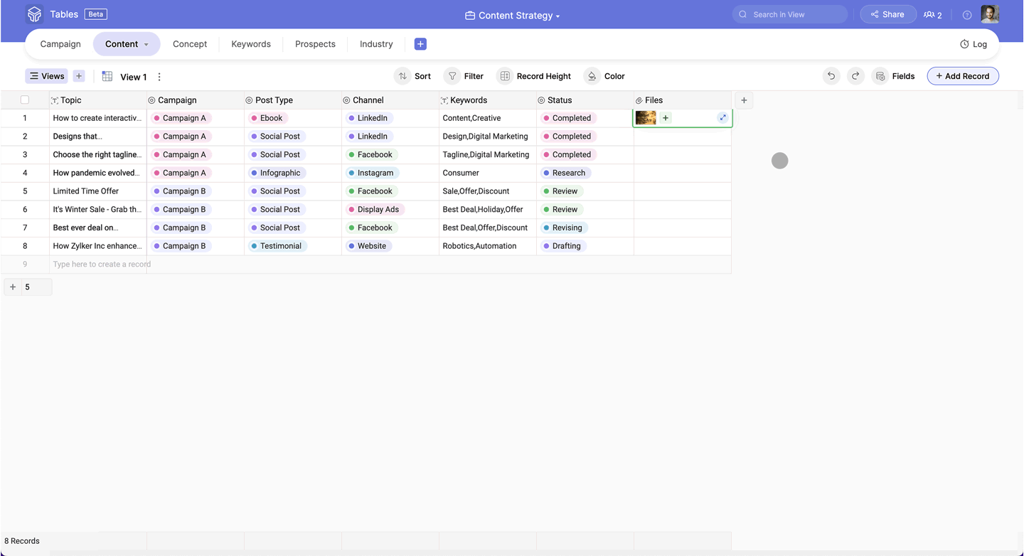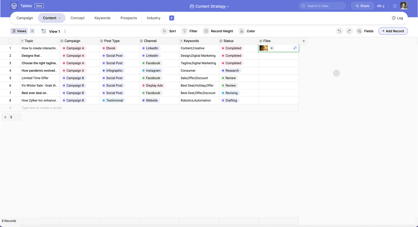 Upon uploading, click on the file thumbnail in a record, and it opens up a preview screen to get a preview of it.
