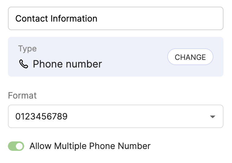 Select phone number from the list of field types, by clicking the + icon from the field header. The field is now ready for phone numbers to be entered.
