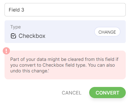 You will get a warning stating, ''Part of your data might be cleared from this field if you convert to Checkbox field type. You can also undo this change.'' Meaning, in some cases, once the field gets converted, the existing data may get cleared off. If you don't want your data to be lost, make sure that you keep your data saved in a different field.