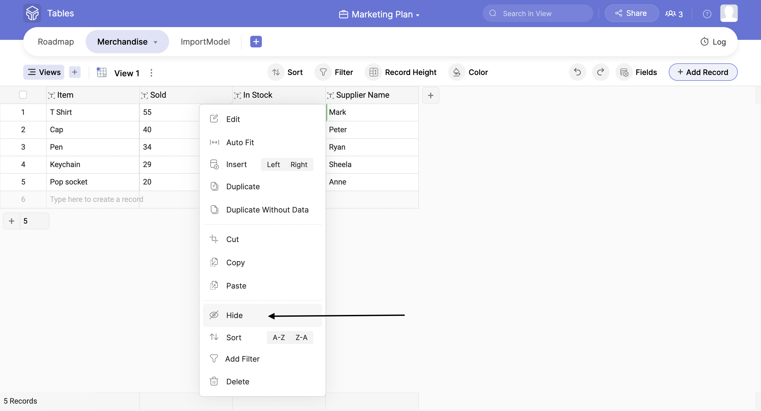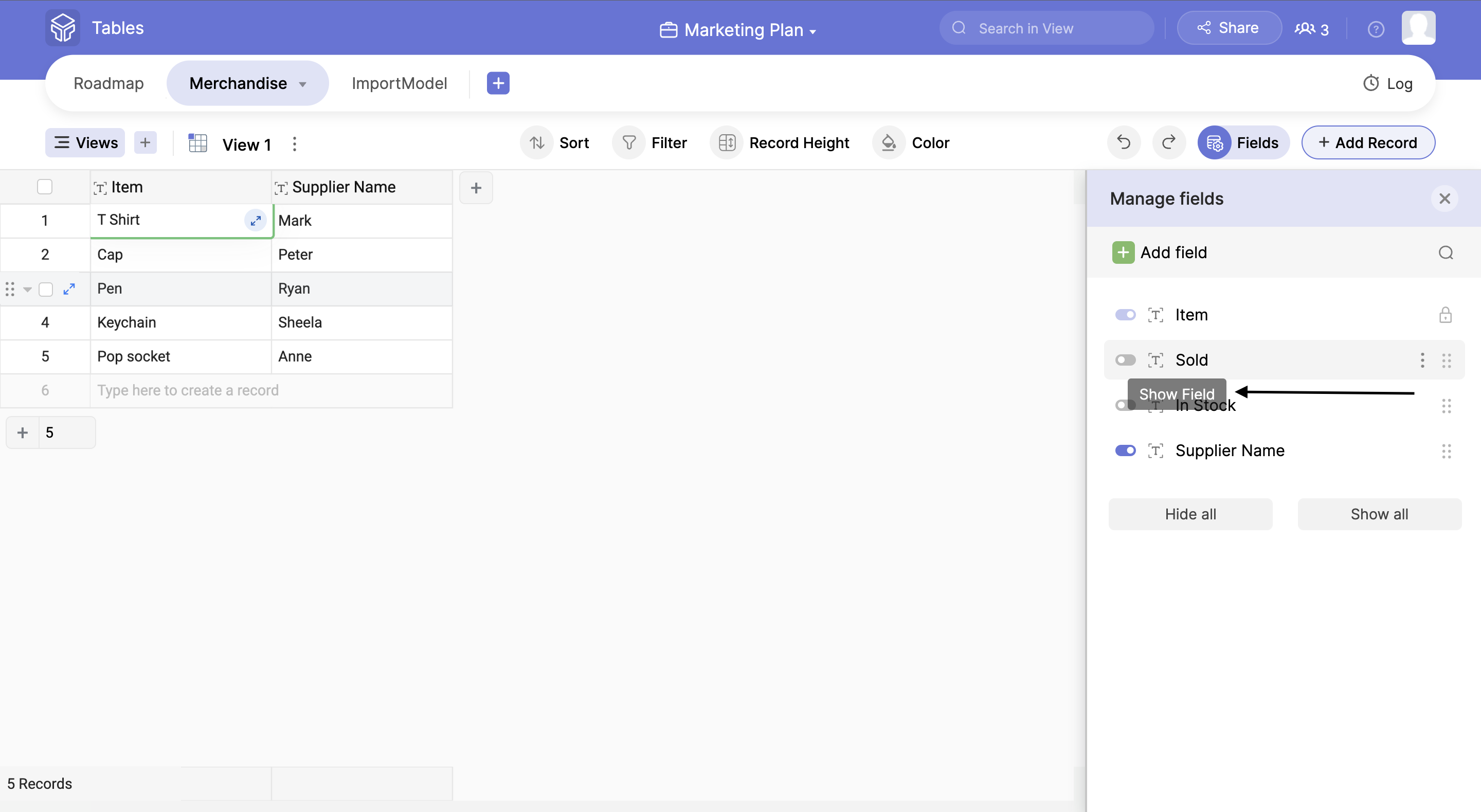 3. Use the toggle switch to choose Show Field / Hide Field.