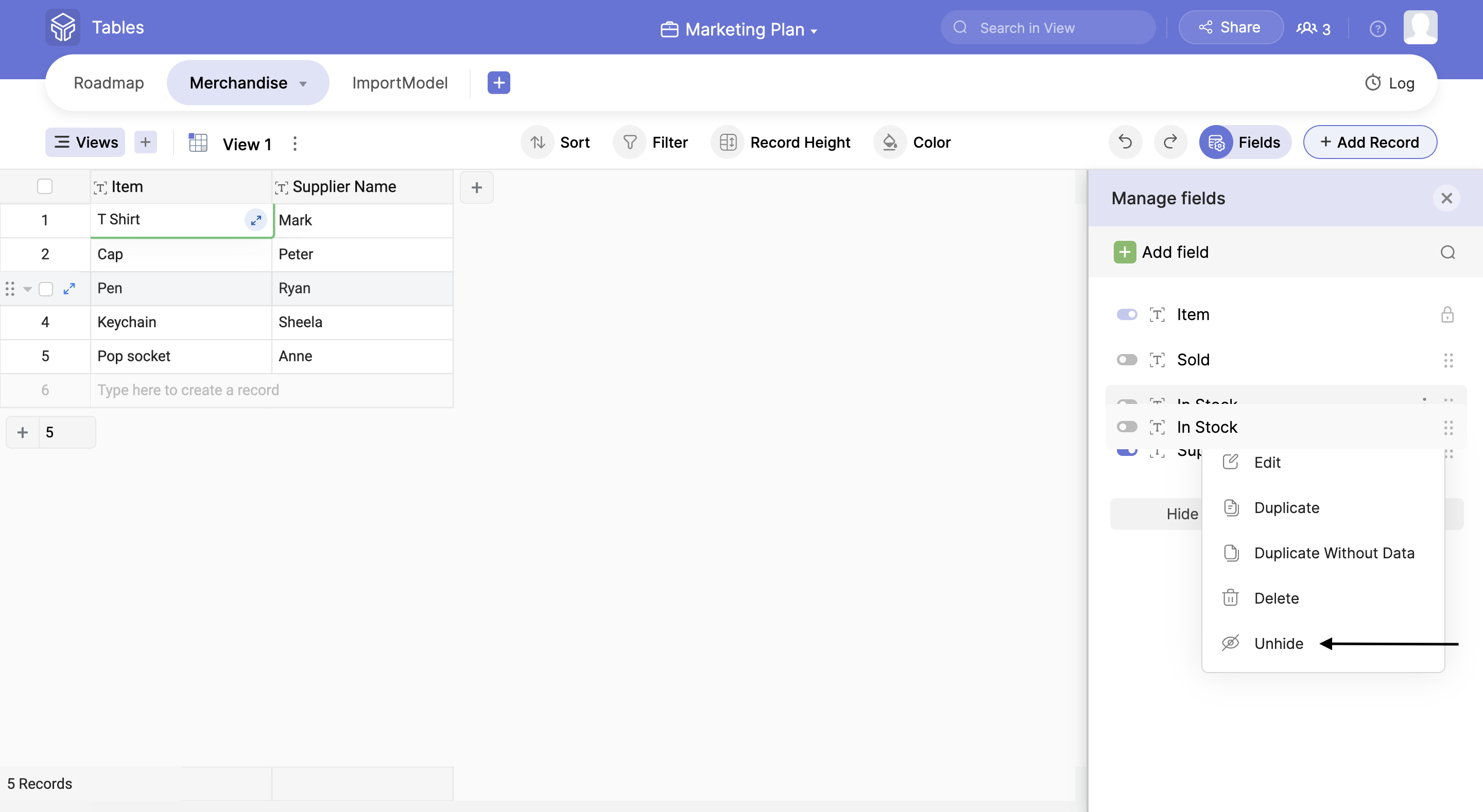2. This opens up a Manage Fields panel, displaying the list of fields on your table.