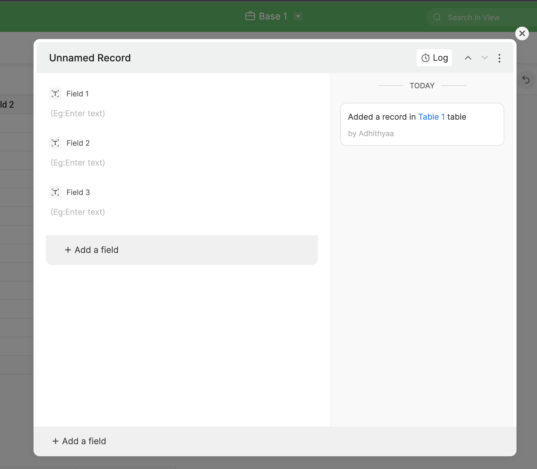 As you click on the Add Record button, it opens up an Unnamed Record dialog box to fill in the field values and close the dialog box.