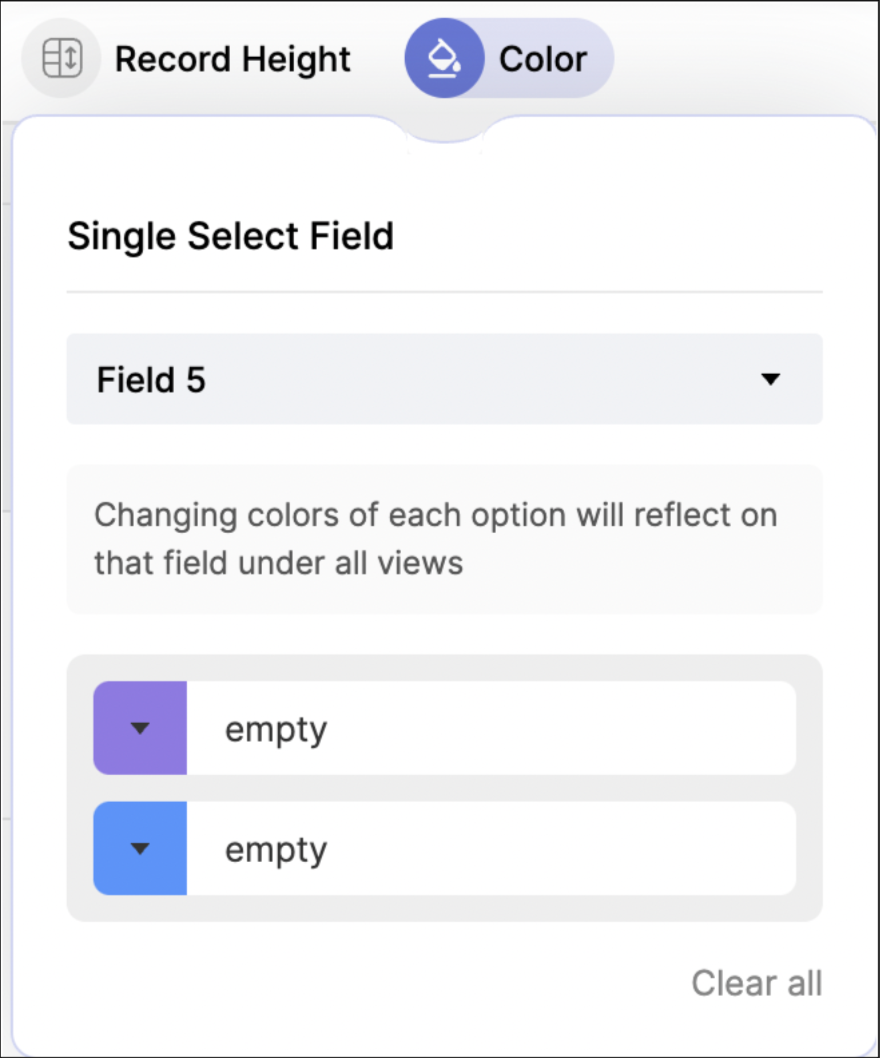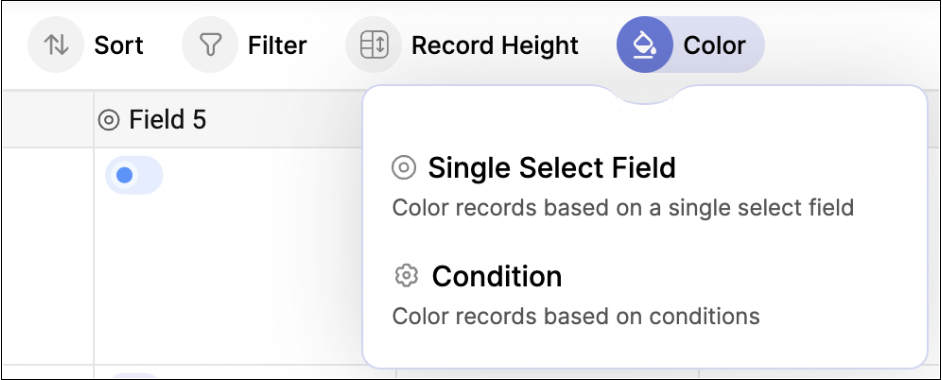 This option will be enabled when you have at least one Single Select Field configured in your table & records will be colored according to the color in the single select field. You can also change the colors as you wish.