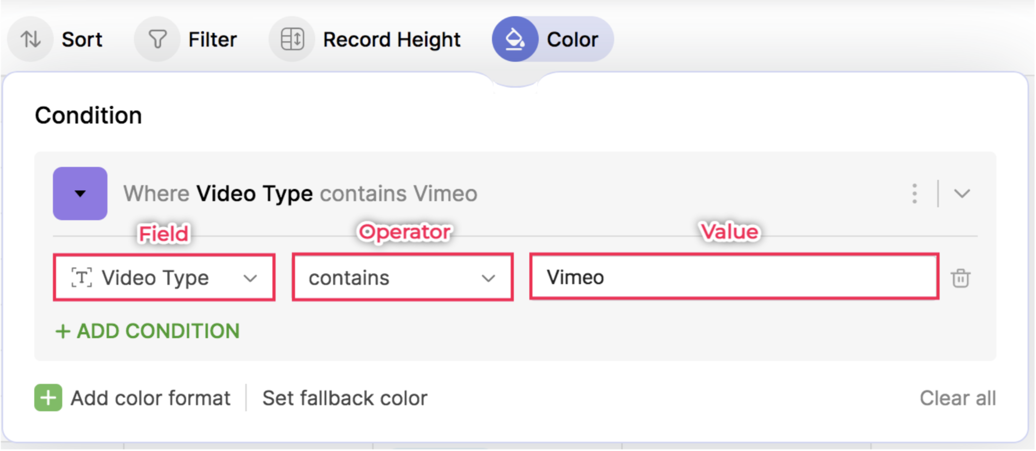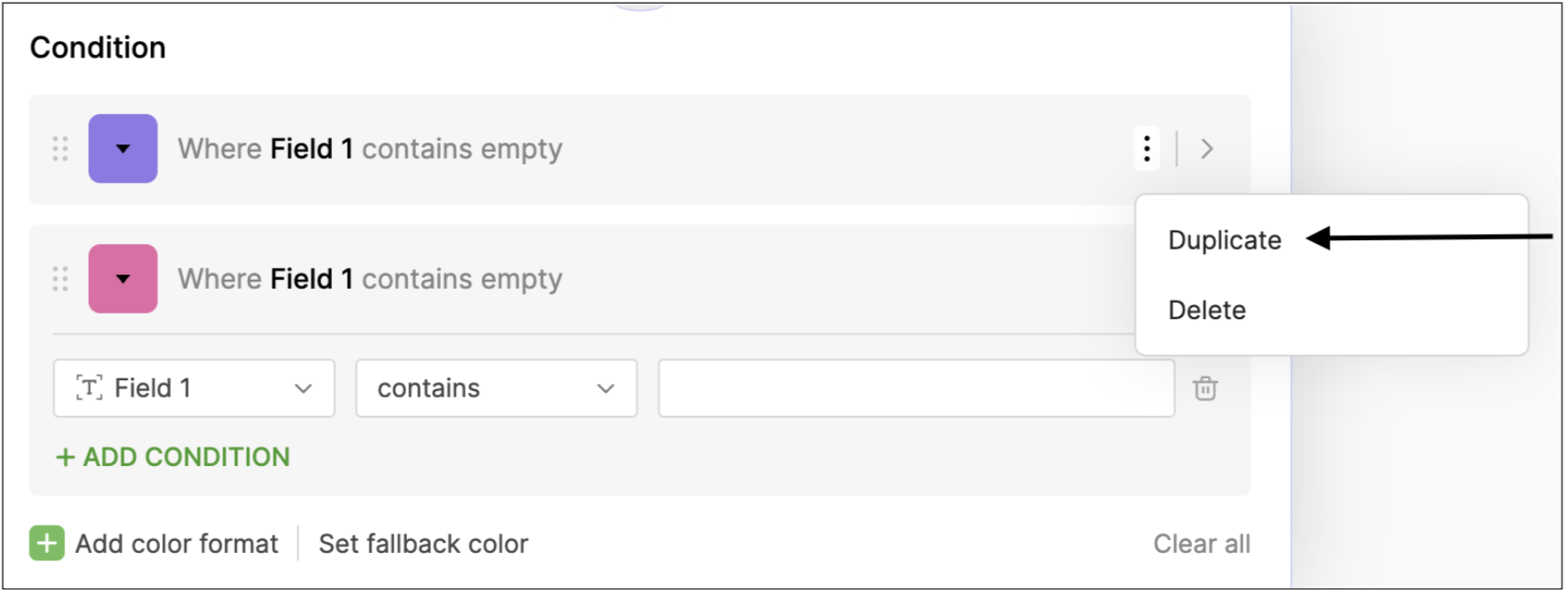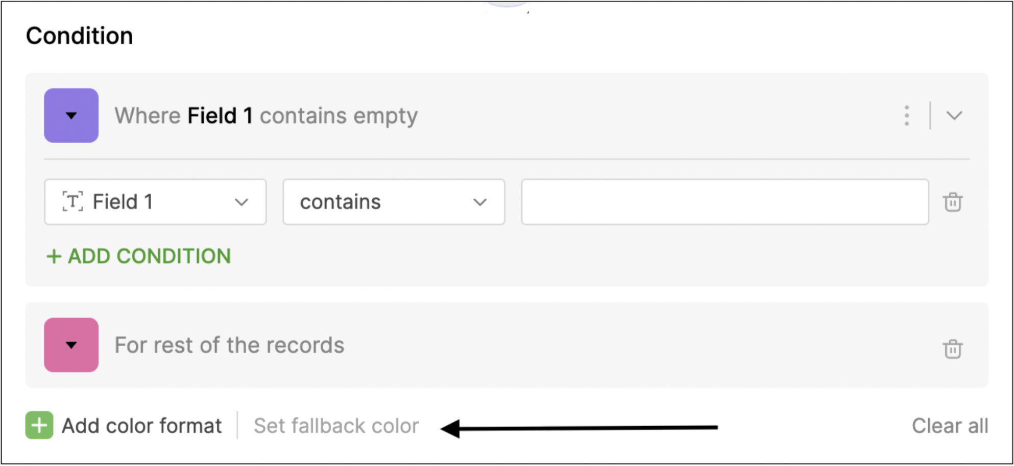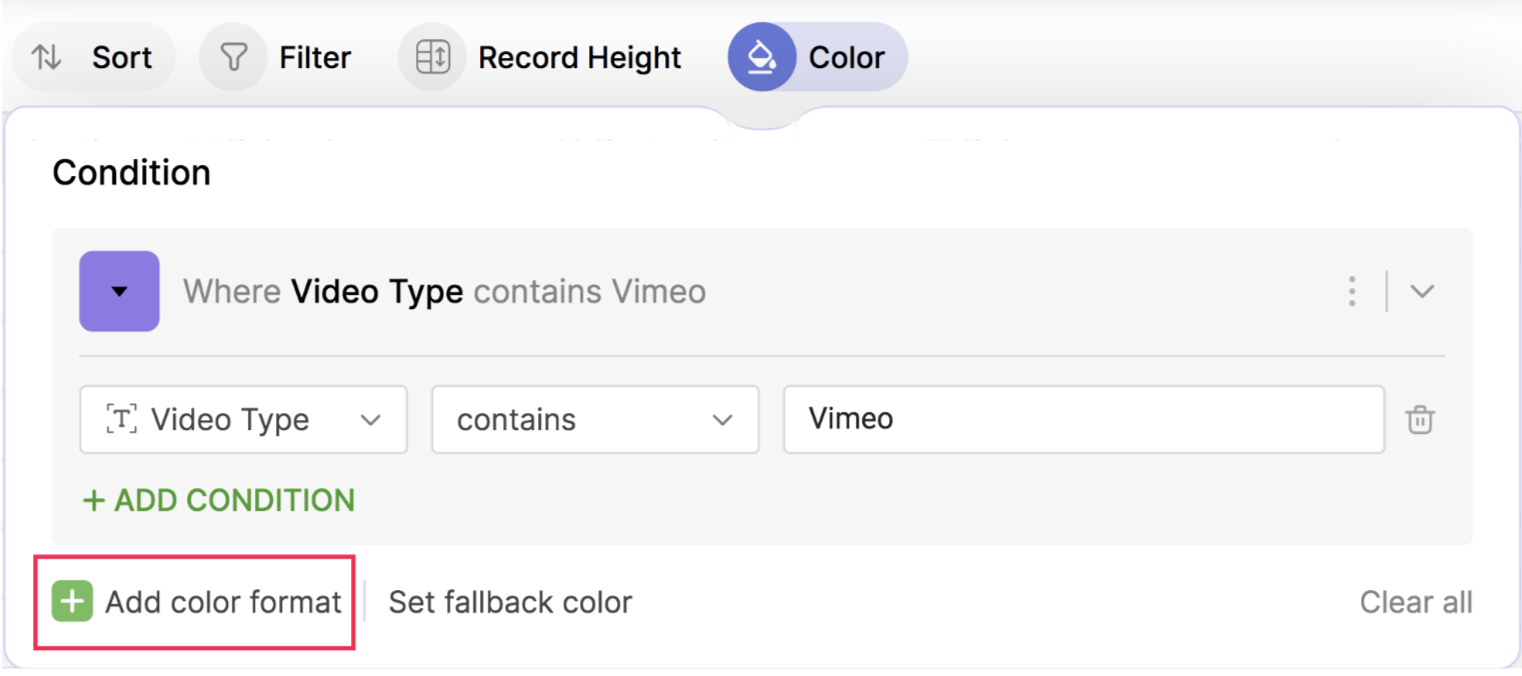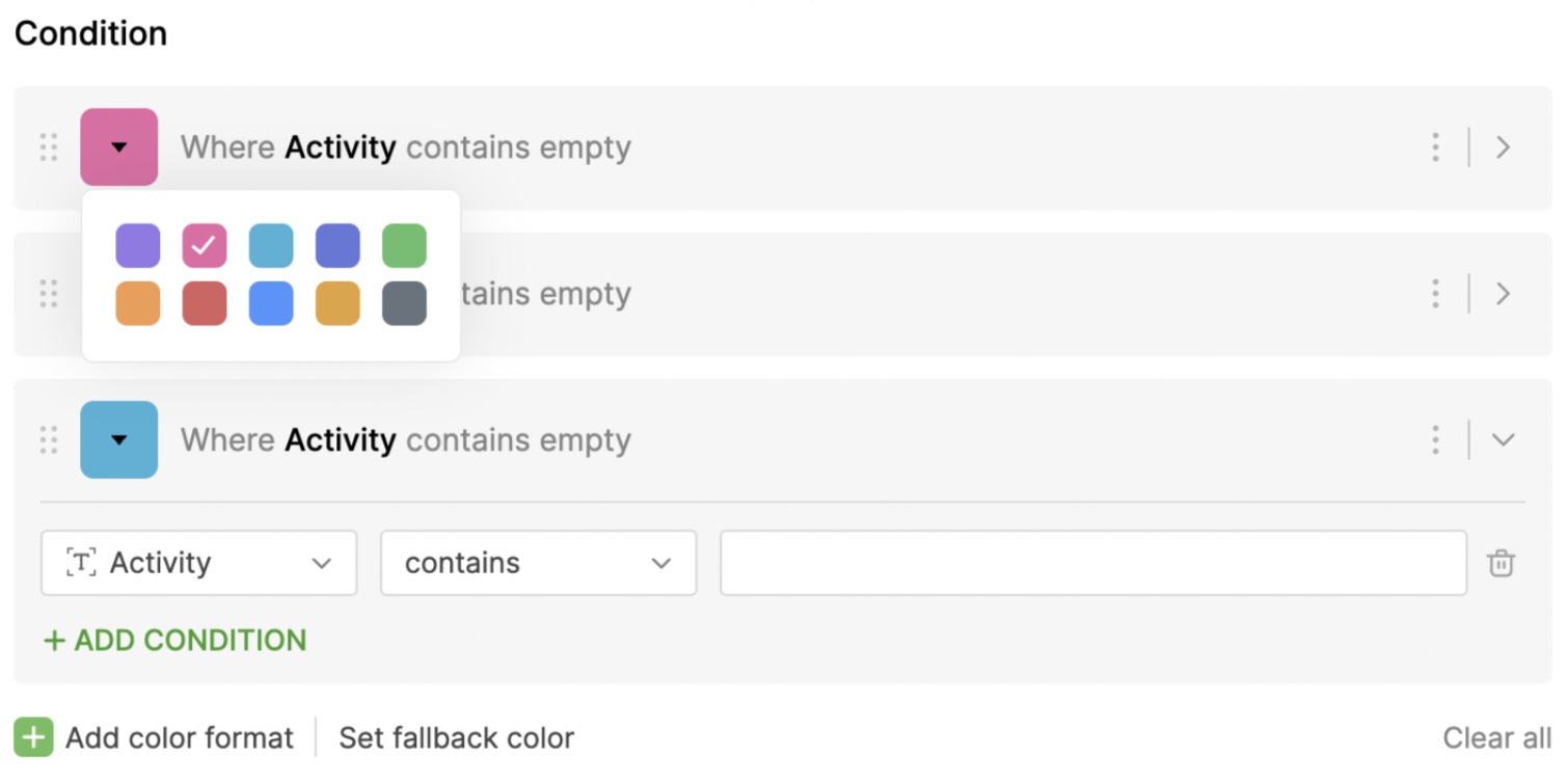 The conditional coloring will color your records based on a set of conditions you configure. Records that comply with those conditions will automatically be assigned the specified color. You can set single or multiple conditions for coloring records.