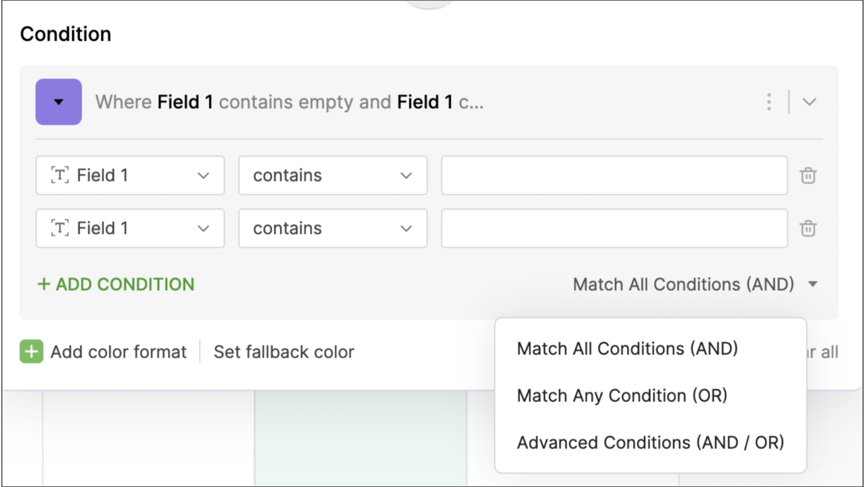Adding more conditions to the same color will form a conditional group, which is a group of conditions connected through a combination of "AND" or "OR" or "AND/OR" conditions.