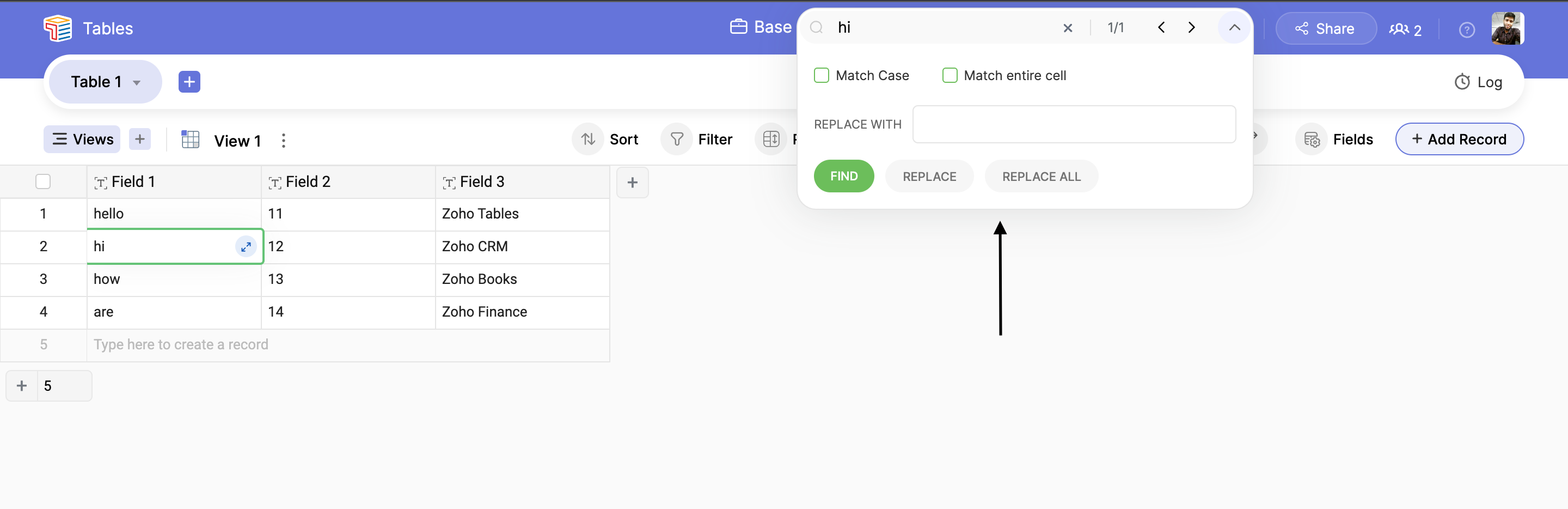 You can search for a particular content in your view using this option. Use the REPLACE WITH option to replace the content. Type the required content in the REPLACE WITH dialog box, and click REPLACE to replace just one instance of that occurrence, or REPLACE ALL to replace all the occurrences. You can also use keyboard shortcuts (ctrl+h/cmd+h) to open the Find and Replace check-box.